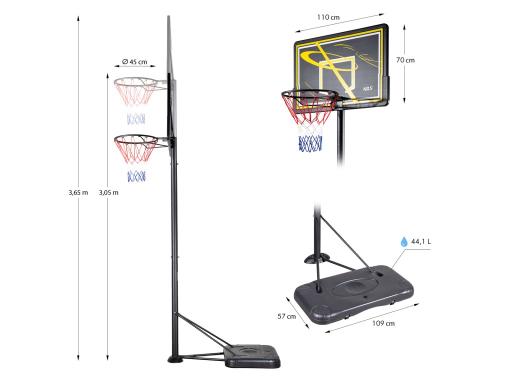 ZDK019E je mobilný voľne stojaci kôš, ktorý sa bude hodiť na individuálne cvičenie alebo skupinové hranie. Nastaviteľná výška umožňuje prispôsobiť kôš výške a schopnostiam používateľa. Výrobky NILS sa vyrábajú predovšetkým z najkvalitnejších materiálov. Doska je vyrobená z odolného PVC materiálu a v spojení s oceľovou obručou zaručuje dlhú životnosť. Prepravné kolieska umiestnené na stabilnej základni s objemom 44 litrov zabezpečujú úplnú mobilitu a stabilitu výrobku. Základňa sa naplní pieskom alebo vodou. Každý prvok konštrukcie je odolný voči poveternostným vplyvom.