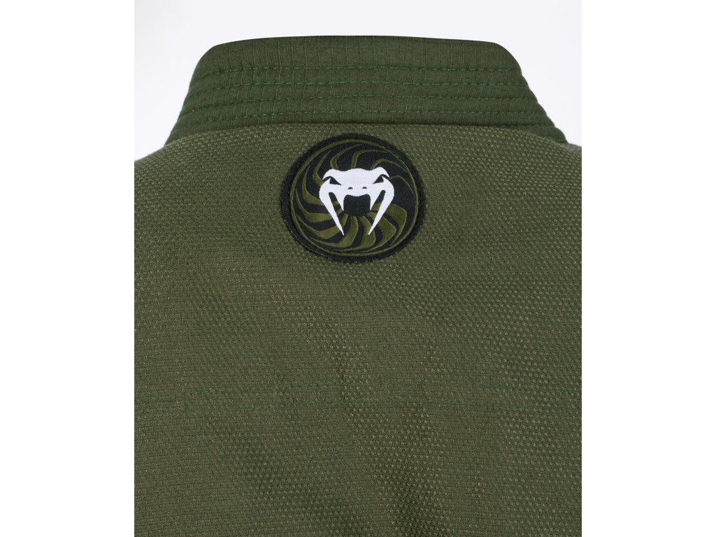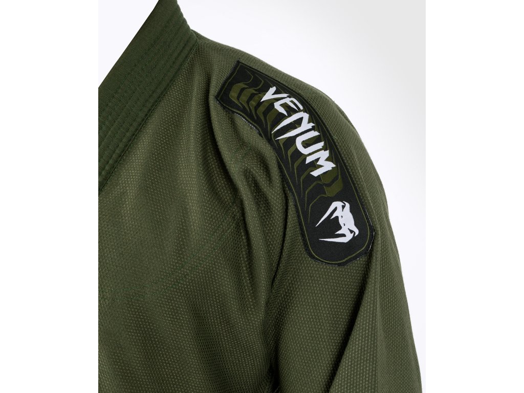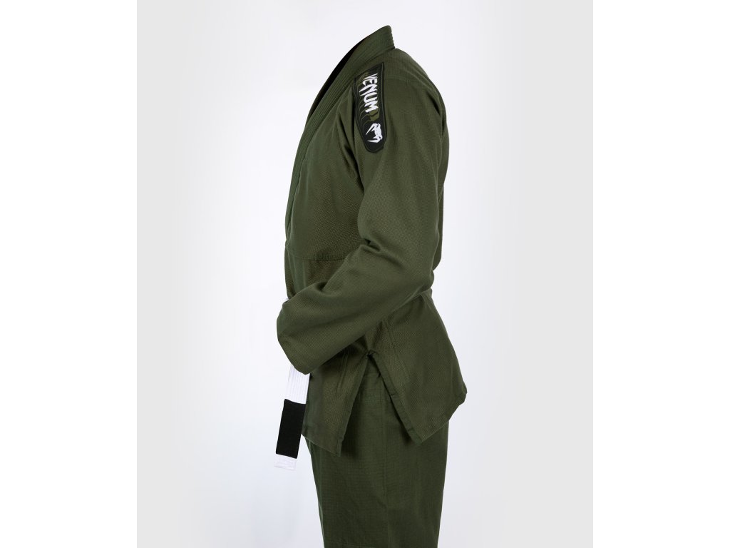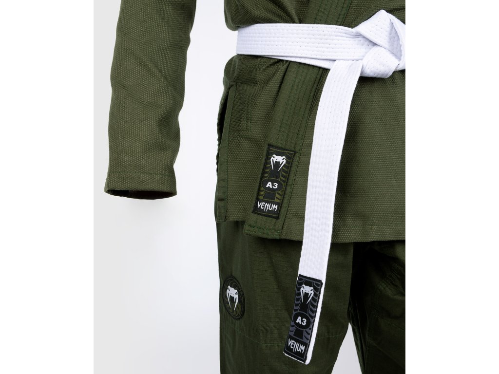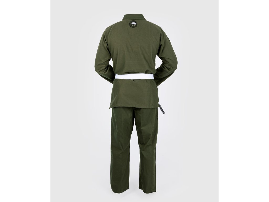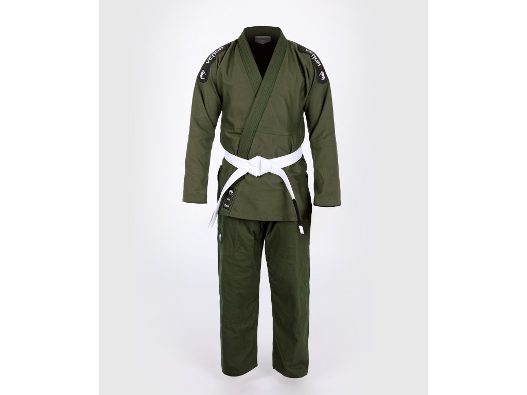 Venum First BJJ Gi in khaki features black patches with Venum logo at the shoulders, lower hem and hip for a complete look. Belt included.