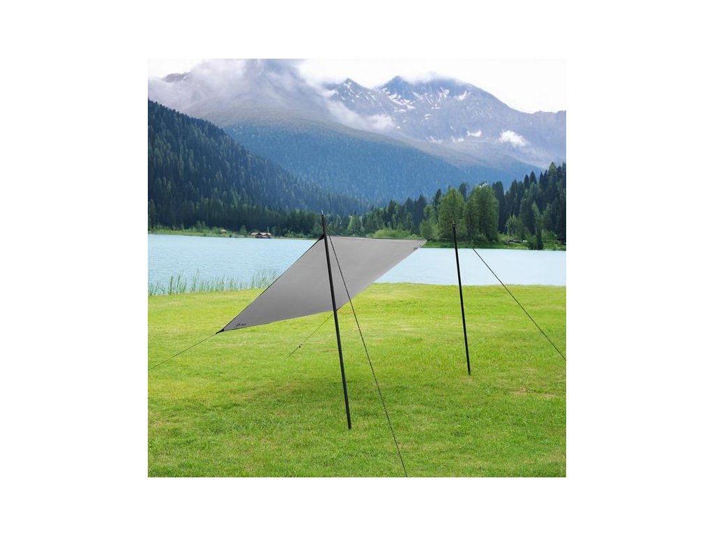 Plachta je vyrobená z odolného polyesteru potiahnutého striebornou vrstvou, ktorá účinne chráni pred dažďom aj nadmerným slnečným žiarením. Obliečka odráža UV lúče a obmedzuje zahrievanie priestoru pod plachtou, čo z nej robí ideálne riešenie pre slnečné aj daždivé dni. Vodeodolnosť na úrovni 1500 mm vodného stĺpca zaisťuje vysoký komfort použitia aj za nepriaznivých poveternostných podmienok.