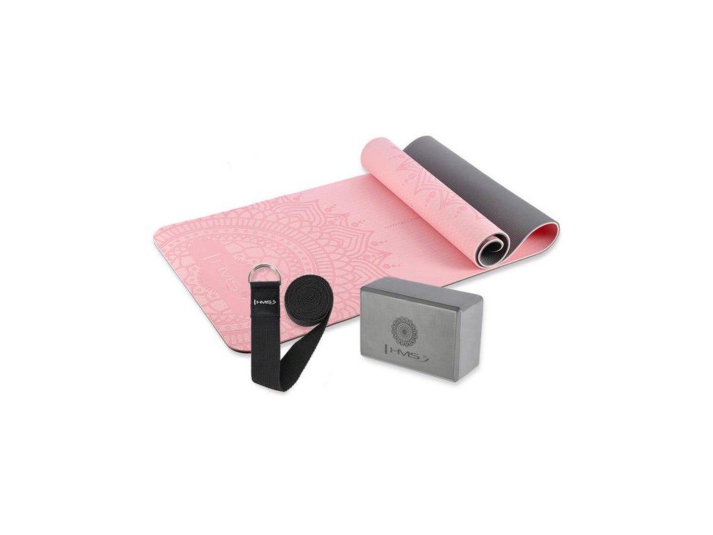 Ružová sada na jogu HMS - podložka YM10, joga blok KJ02 a popruh SJ02