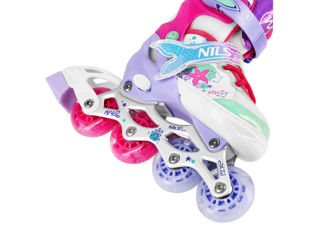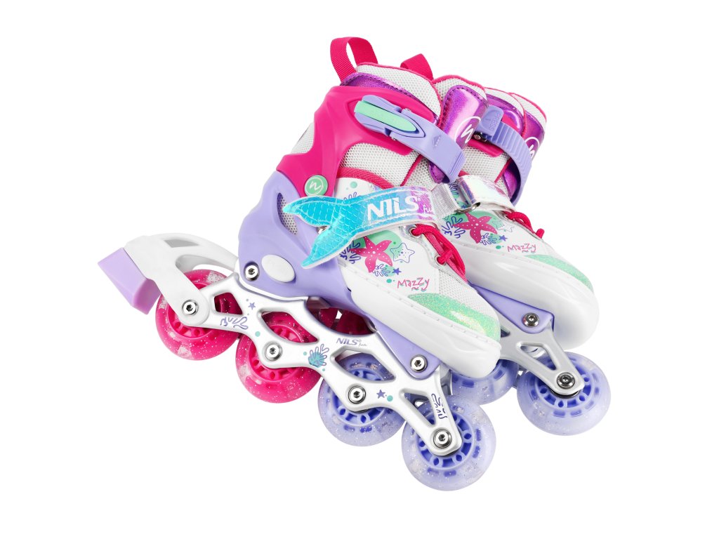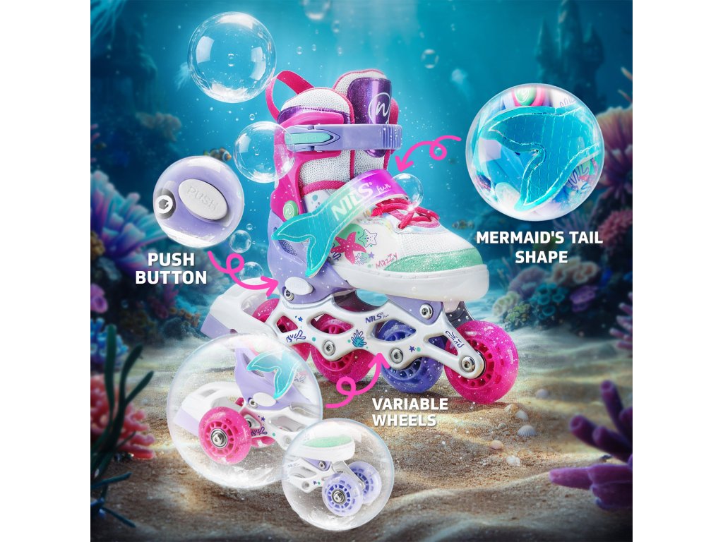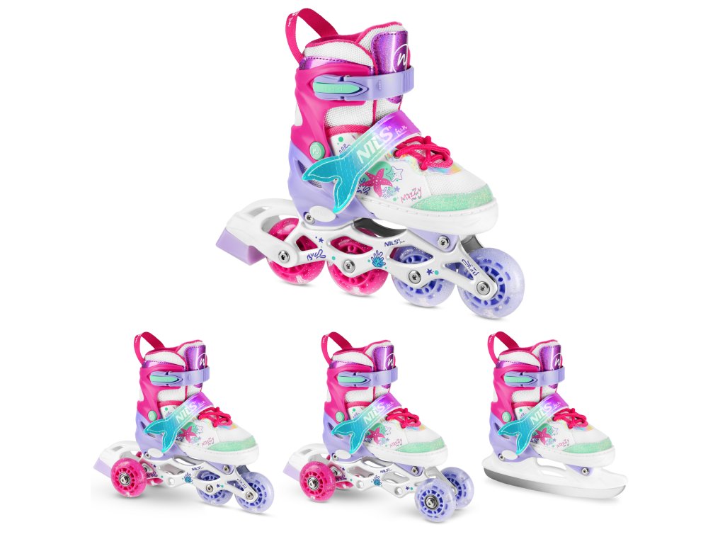 NH18150 MAZZY značky NILS Fun je jedinečný detský set 4v1, ktorý spája funkčnosť, bezpečnosť a atraktívny rozprávkový dizajn inšpirovaný podmorským svetom. Jeden produkt ponúka až štyri konfigurácie – kolieskové korčule, ľadové korčule, quad korčule a 2+1+1 pre začiatočníkov – a je tak ideálny na celoročné využitie.