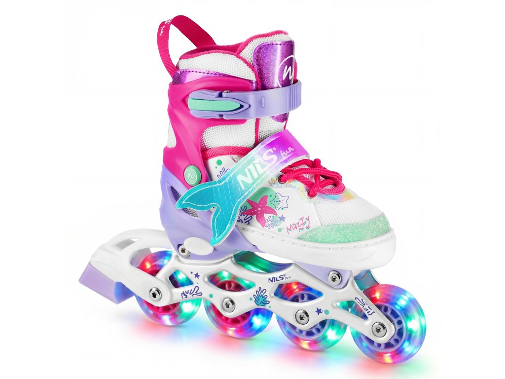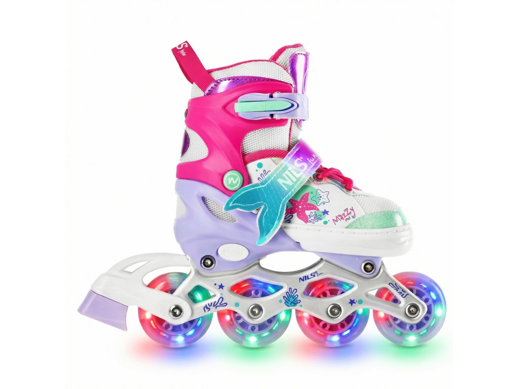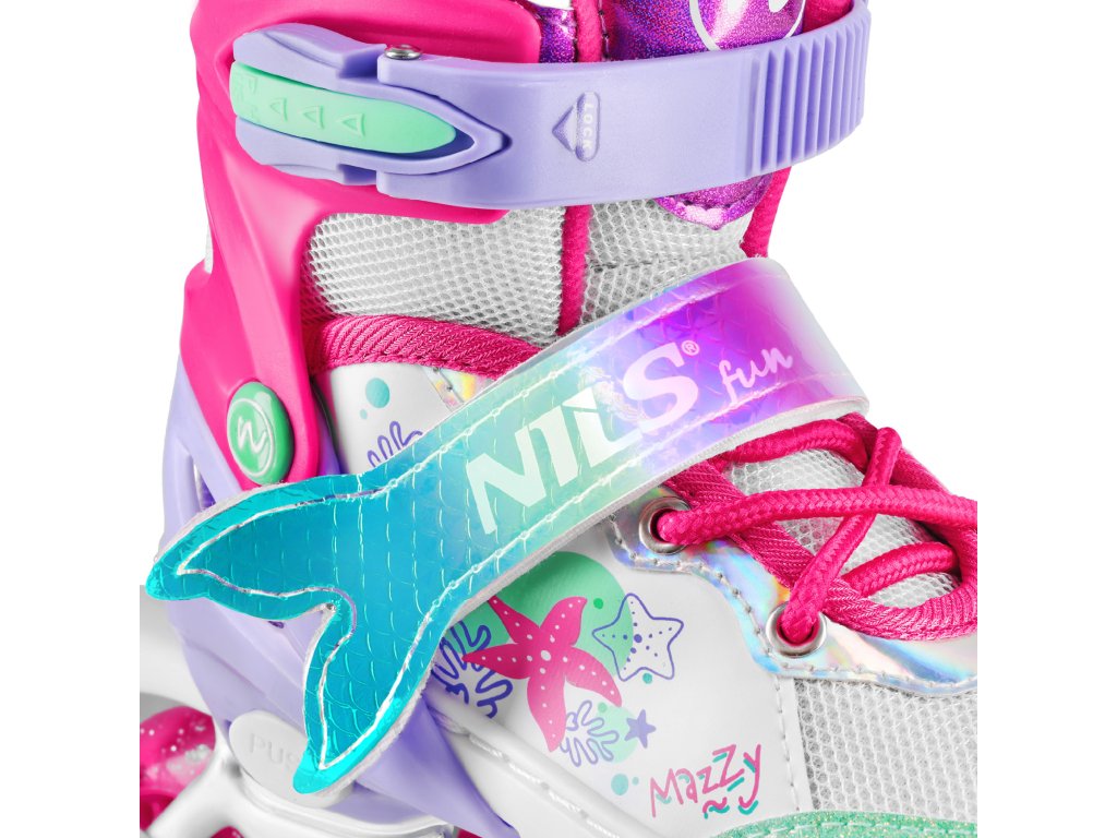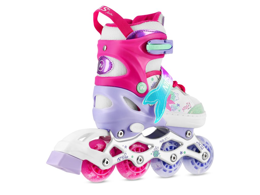 NH18150 MAZZY značky NILS Fun je jedinečný detský set 4v1, ktorý spája funkčnosť, bezpečnosť a atraktívny rozprávkový dizajn inšpirovaný podmorským svetom. Jeden produkt ponúka až štyri konfigurácie – kolieskové korčule, ľadové korčule, quad korčule a 2+1+1 pre začiatočníkov – a je tak ideálny na celoročné využitie.