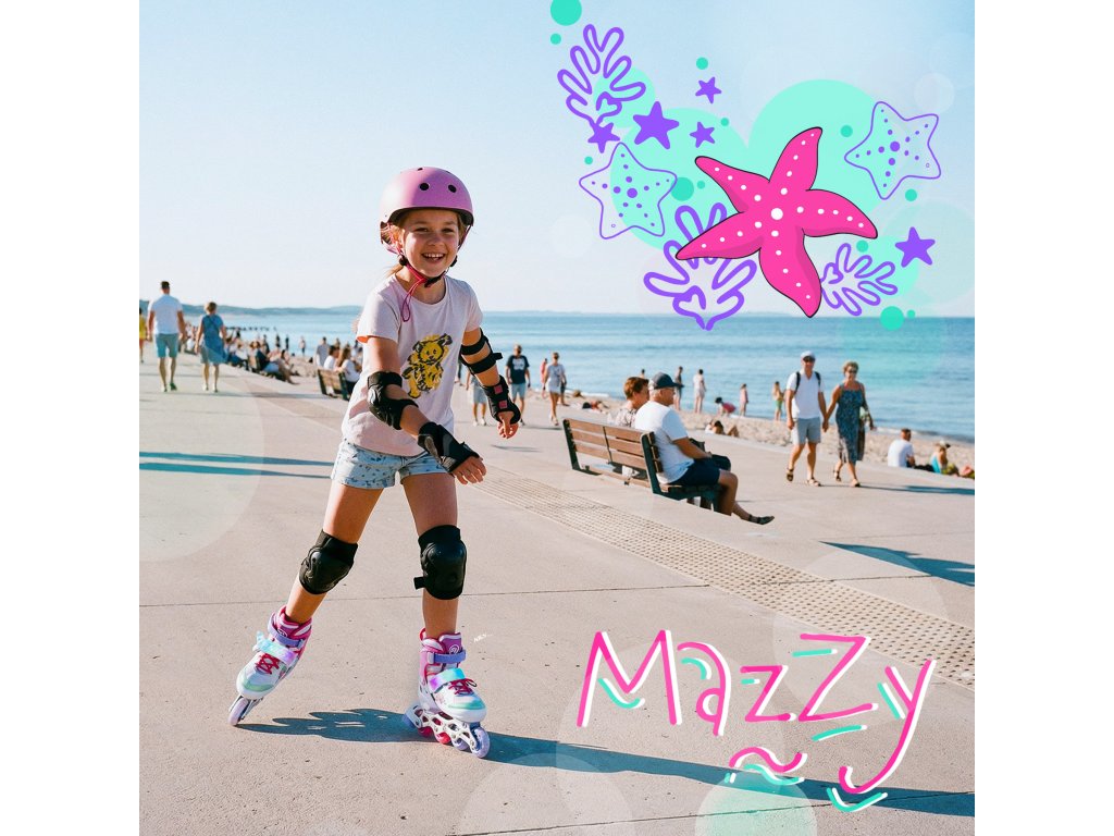 Model MAZZY zaujme farebným motívom morskej víly a podmorského sveta. Pastelové odtiene, morské detaily a svietiace LED kolieska, ktoré sa aktivujú počas jazdy, premenia každú jazdu na zábavný zážitok. LED efekt nielen skvele vyzerá, ale zároveň zvyšuje viditeľnosť dieťaťa.