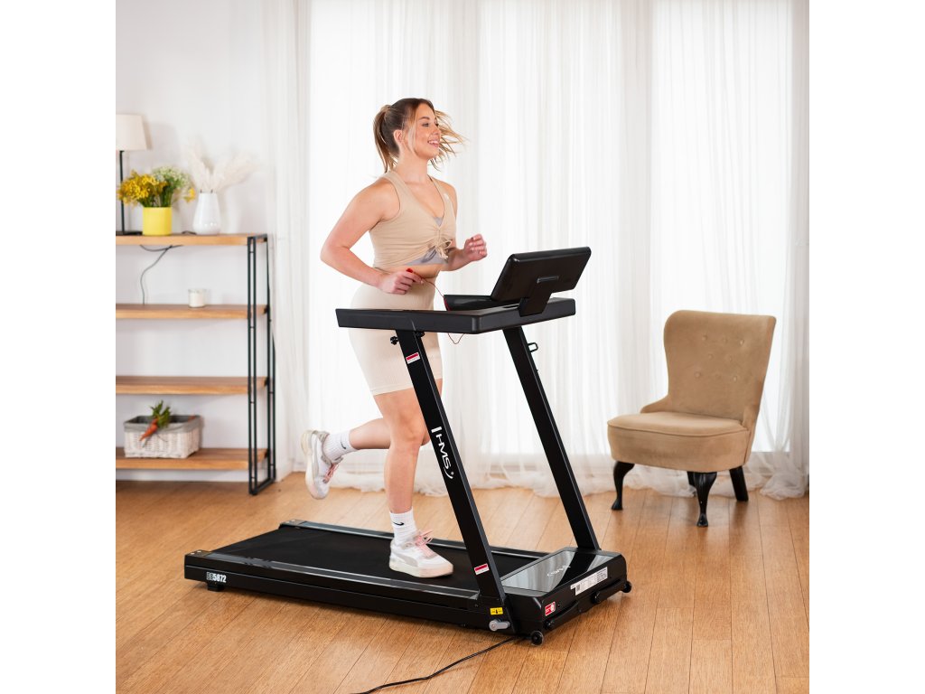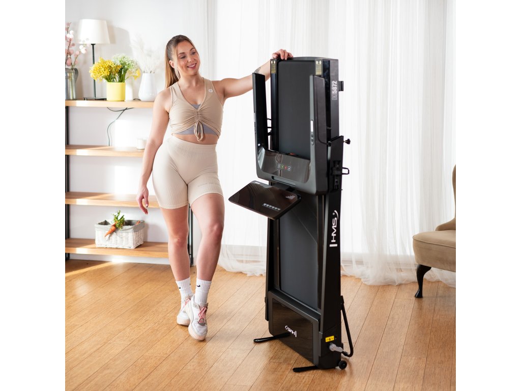 BE5872 ponúka bežeckú plochu s rozmermi 122 x 44 cm a systém odpruženia, ktorý zvyšuje pohodlie a znižuje riziko namáhania kĺbov pri behu. Zariadenie sa ľahko skladuje vďaka možnosti zloženia a uloženia v ležiacej alebo zvislej polohe. Vďaka kompaktným rozmerom v zloženom stave a prepravným kolieskam ho môžete uložiť napríklad pod posteľ alebo ho voľne postaviť k stene - na tento účel slúžia sklopné opierky na prednom kryte trenažéra.