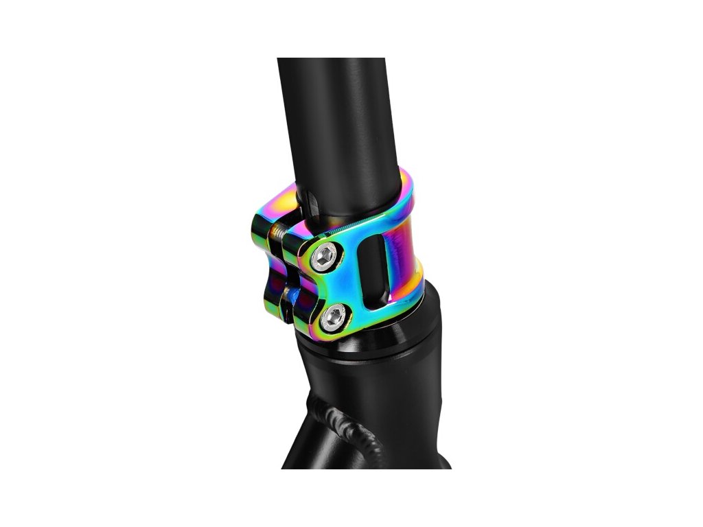 Freestyle kolobežka nemá žiadny skladací mechanizmus ani systém nastavenia výšky riadidiel - tieto typy riešení by mohli oslabiť celú konštrukciu, čo samozrejme nie je žiaduce pri výrobku, pri ktorom je dôležitá odolnosť. Pri vykonávaní trikov sa konštrukcia stretáva s veľmi vysokým zaťažením. Vďaka použitiu masívnej ocele a pevného hliníka je takmer nemožné preťažiť model HS024 PRO až na hranicu možností, takže môžete s maximálnou istotou vykonávať aj zložité a náročné triky.