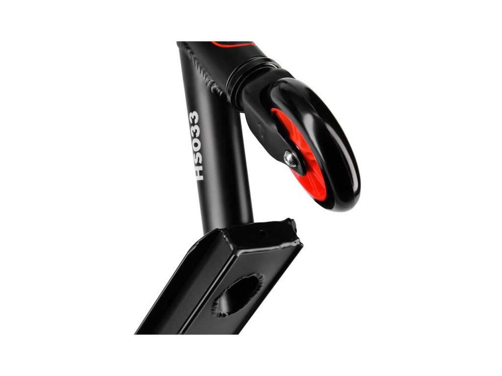 Kolobežka HS033 má jednokomorový hliníkový deck a široké riadidlá bez závitov, ktoré sú pripevnené pomocou svorky so štyrmi skrutkami. Náboj riadidiel je skrutkový. Riadidlá samozrejme umožňujú otáčanie o 360°. Gumové rukoväte zabezpečujú pevné uchopenie.