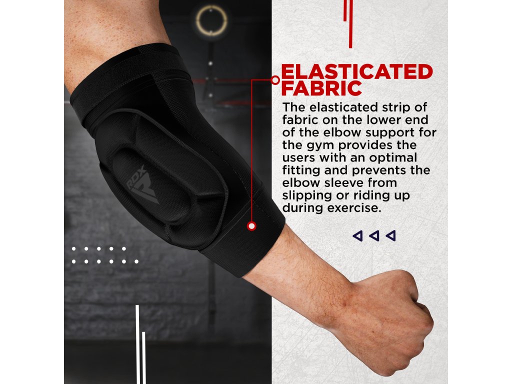Experience top-notch elbow protection with RDX Elbow Foam Pads. Thoughtfully designed, featuring OEKO-TEX® Standard 100 certification for safety, premium elasticated polyester for comfort, and advanced Max-ShockTM Equilibrium Foam and SpongeX padding for protection. The incorporated elbow patch reduces force impact, while the elasticated hook and loop closure ensures a secure fit. You get unrestricted motion with 7-inch wide pads. They effectively safeguard elbow pressure points and feature breathable, sweat-wicking, machine-washable materials. Available in four different colours and sizes for a personalised fit.