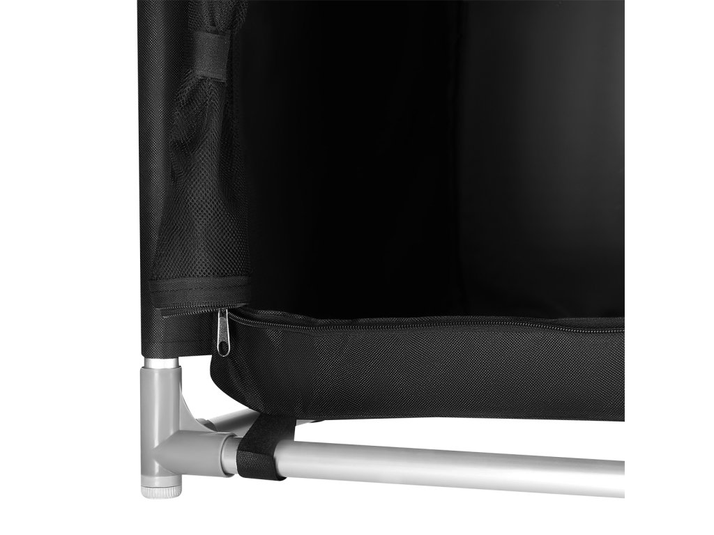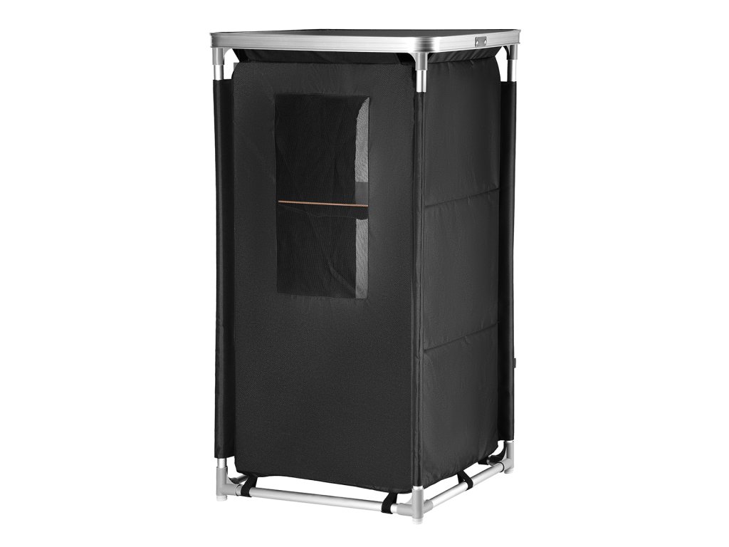 Rám skrinky tvoria hliníkové rúrky s priemerom 19 milimetrov, ktoré sú spojené plastovými spojkami. Spodné spojky sú vybavené výstupkami, ktoré zabraňujú ležaniu rámu na zemi, vďaka čomu nie je potrebné hľadať rovinu a skrinka je stabilná aj na nerovnom povrchu. Samotná skrinka je vyrobená z polyesteru v povrchovej úprave oxford 600D. Táto tkanina je mimoriadne odolná voči poškodeniu a poveternostným podmienkam, ako je dážď a sneh. Látka sa navlieka na rúrky, ktoré sa potom spoja a skrinka sa v spodnej časti uzavrie pomocou suchých zipsov. Skrinka sa potom vybaví 3 policami z MDF a práca je hotová. Súčasťou balenia je doska z MDF s hliníkovým okrajom, ktorá sa pripevní na skrinku a slúži ako praktický stolík. Predný panel je vyrobený zo sieťoviny na cirkuláciu vzduchu, dá sa zrolovať až po okraj a zaistiť popruhmi alebo uzavrieť dvojitým zipsom. Zadná časť skrinky je vybavená neodnímateľnou sieťovinou.