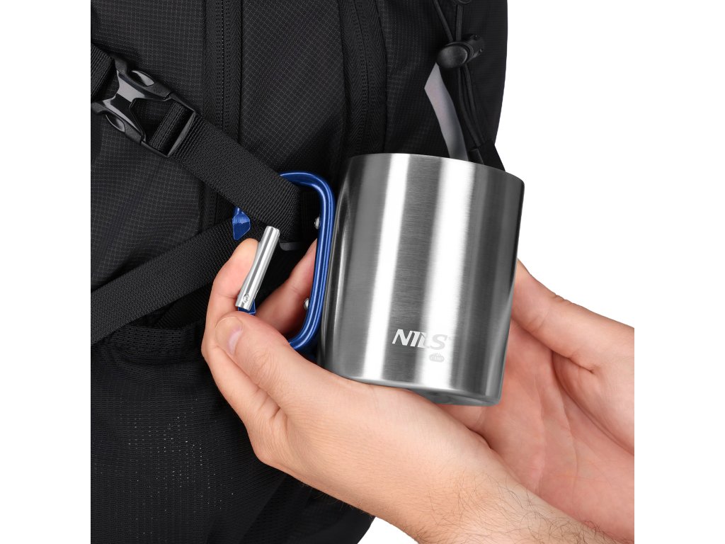 Miesto klasického ucha je hrnček vybavený funkčnou karabínou, ktorá slúži zároveň ako rukoväť. Umožňuje pripevniť hrnček k batohu, taške alebo opasku, takže ho máte vždy po ruke bez toho, aby ste ho museli ukladať dovnútra batožinu. Ide o pohodlné a nápadité riešenie, ktoré oceníte najmä pri aktívnom odpočinku.