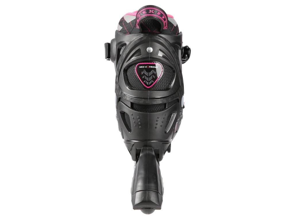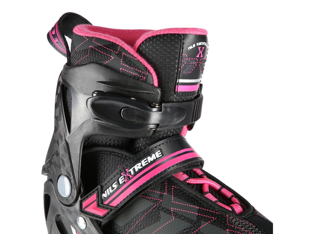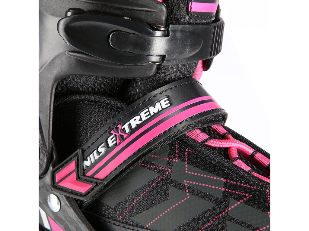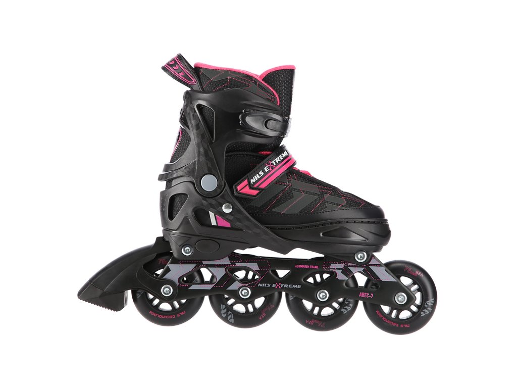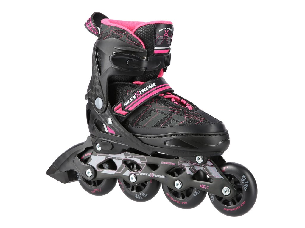 Kolieskové korčule NILS Extreme NA11002 sú určené k rekreačnej jazde začínajúcich a mierne pokročilých korčuliarov po rovných a hladkých chodníkoch, ako napríklad po asfalte. Ľahká a odolná topánka zaisťuje bezpečnosť pri jazde. Systém ventilácie a tvarovaná stielka topánky priamo ovplyvňujú zvýšenie užívateľského komfortu. Jedná sa o model s nastaviteľnou veľkosťou, kedy každá korčule má na výber zo 4 rozmerov. Pomocou jednoduchého riadiaceho systému je možné ľahko a rýchlo nastaviť veľkosť topánky na nohe používateľa. Kolieska s tvrdosťou 82A sú uložené v hliníkovej lište, dobre priliehajú k podkladu a čiastočne pohlcujú nervnosti. Model NA11002 je osadený ložiskami ABEC 7, ktoré sa vyznačujú precíznym spracovaním a nízkym odporom, kedy jazda má dobrú zotrvačnosť a na korčuliach tak možno prejsť dlhú vzdialenosť bez vynaloženia zbytočnej sily.