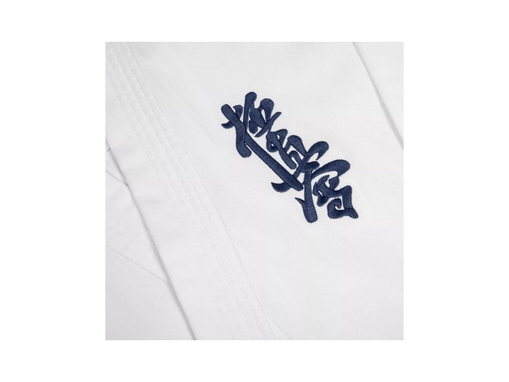 Blúzka kimona má široké spadnuté rukávy s 3/4 dĺžkou a tmavomodrú výšivku Kyokushin na ľavej strane hrude, čo jej dodáva osobitý vzhľad.