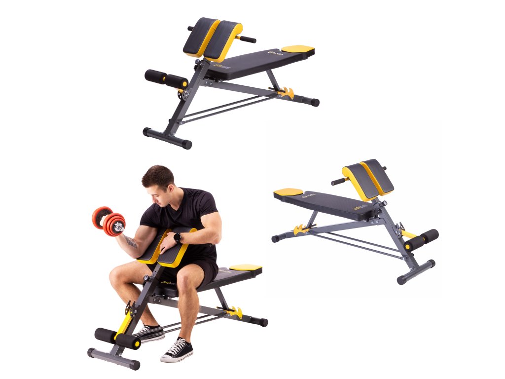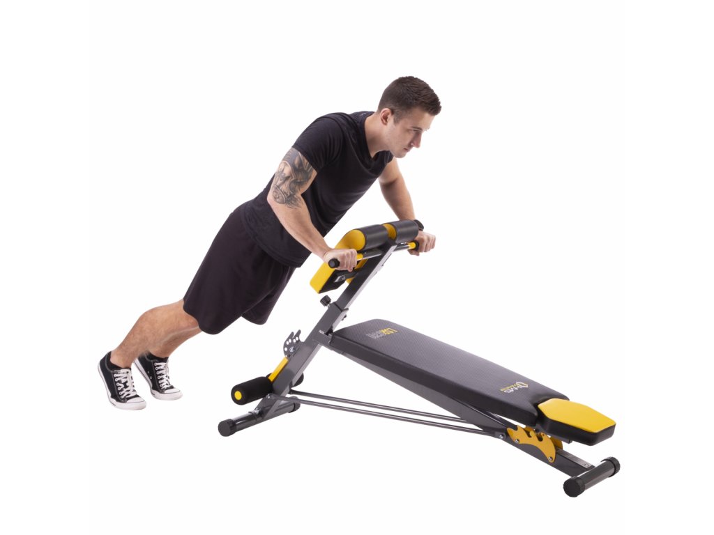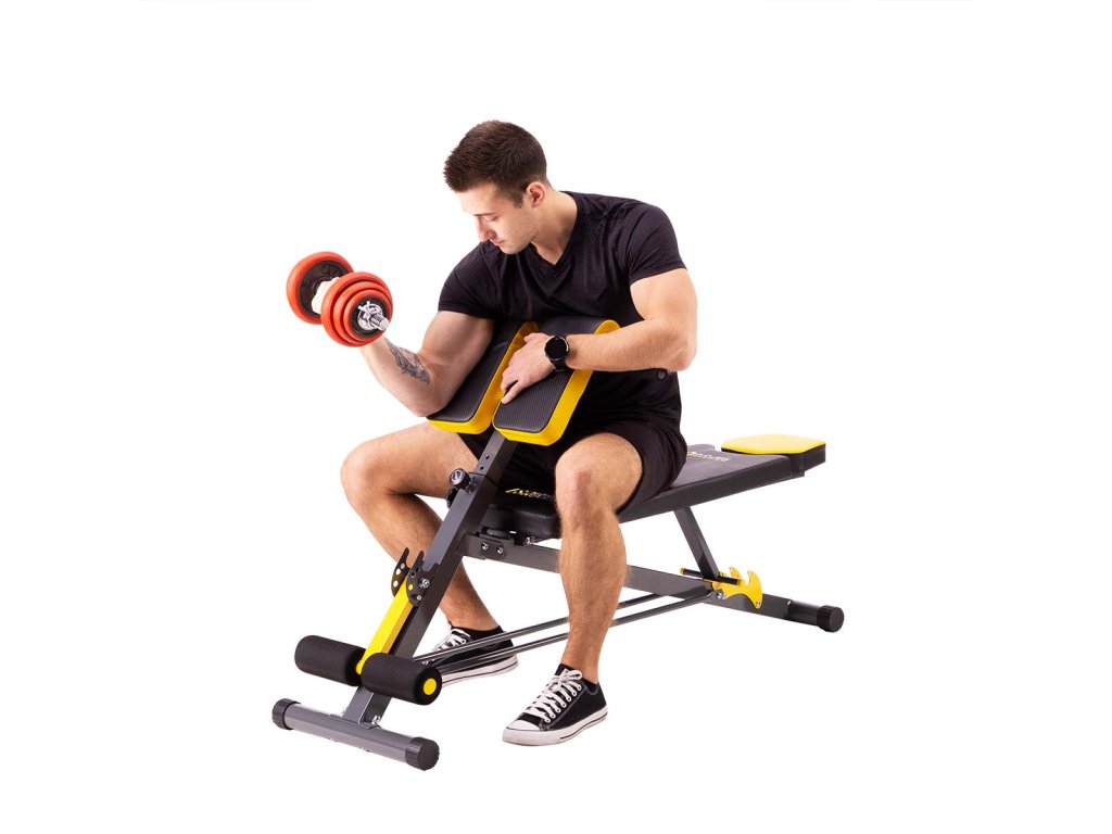 Opierka nôh s penovými valčekmi je nastaviteľná do 4 polôh. Madlá pod bicepsovým pultom sa používajú na tréning klikov.
