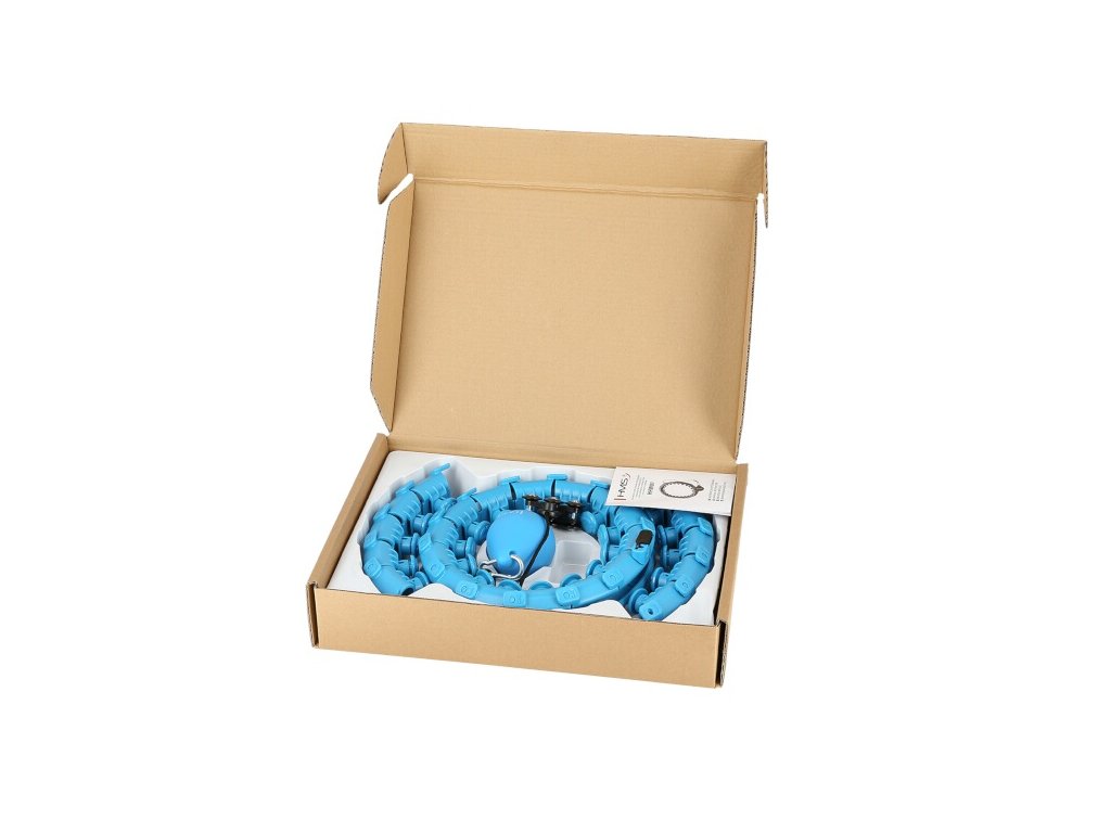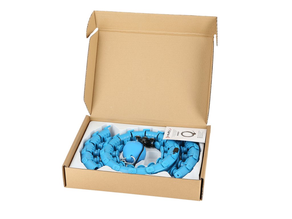 Funkcia obruče HMS HHW01 je veľmi jednoduchá. Konštrukcia pozostáva z 24 rovnakých častí, ktoré sa skladajú do seba. Aby ste obruč uzavreli, musíte použiť aspoň 14 kusov, ktoré potom vytvoria kruh s vnútorným priemerom 15 cm, ak spojíte všetkých 24 kusov, potom bude vnútorný priemer 34 cm. Model HHW01 je vhodný pre obvod pása od 46 do 105 cm. Jednotlivé diely tvoria koľajnicu, do ktorej sa pred zatvorením vloží kotva, ktorá je vybavená šiestimi kolieskami s guľôčkovými ložiskami. Ku kotve je pomocou dĺžkovo nastaviteľného povrázka pripevnené závažie s hmotnosťou 400 gramov. Šnúru možno nastaviť na dĺžku 22 až 38 cm a zmenou dĺžky šnúry sa upravuje výsledná odstredivá sila závažia - čím dlhšia je šnúra, tým "ťažšie" bude závažie.