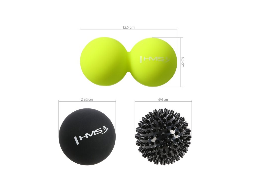 Súprava masážnych loptičiek HMS BLS01 je dokonalým doplnkom väčších masážnych prístrojov. Loptička HMS BLC01 s priemerom 6 cm je ideálna na masírovanie spúšťacích bodov a miest s napätou fasciou. Dvojitá lopta HMS BLC02 je ideálna na ošetrenie hlbokých svalových skupín alebo ťažko dostupných častí tela, ako sú krk, zadok, ramená a hrudník. Pomocou loptičky s hrotmi HMS BLP01 možno ošetriť potenciálne zdroje bolesti.