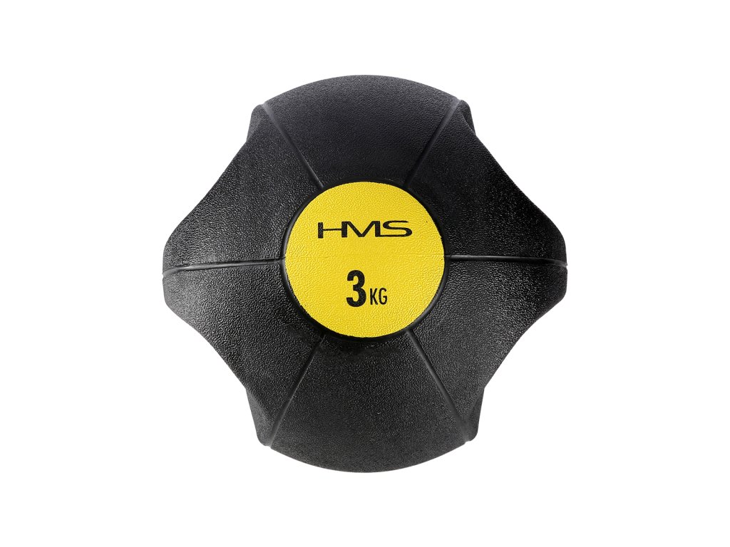 Medicinbal HMS NKU03 je vyrobený z hrubej a pevnej gumy vyplnené pieskom. Vďaka úchytom ide o kombináciu medicinbalu a činky.