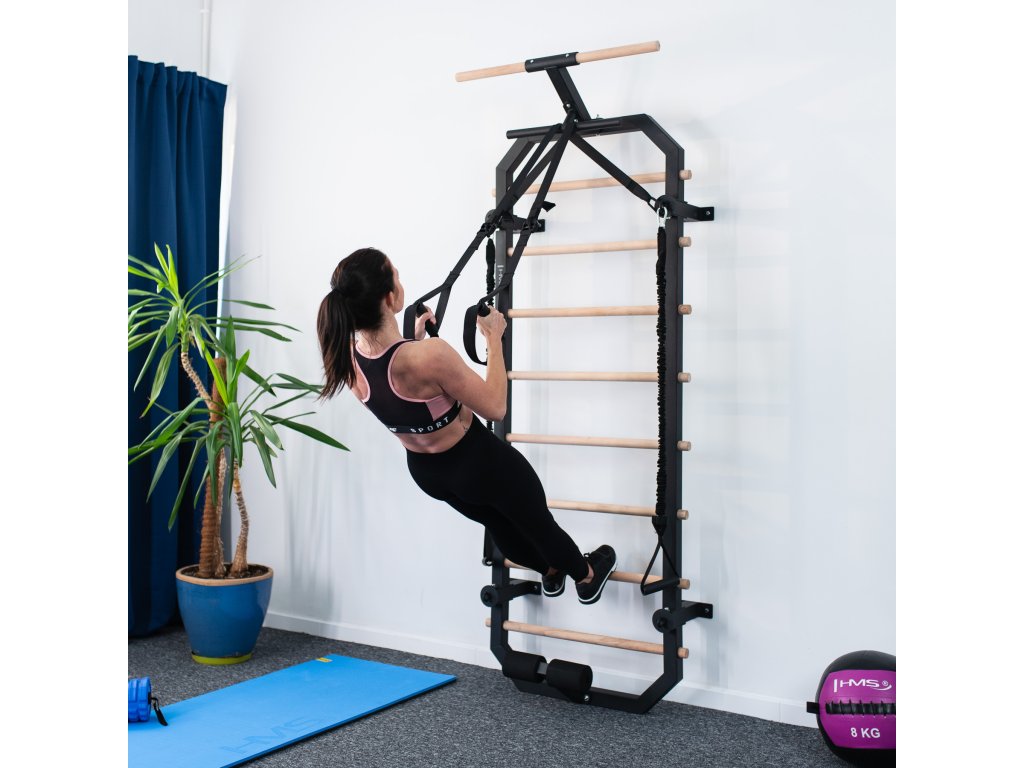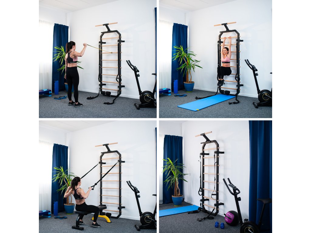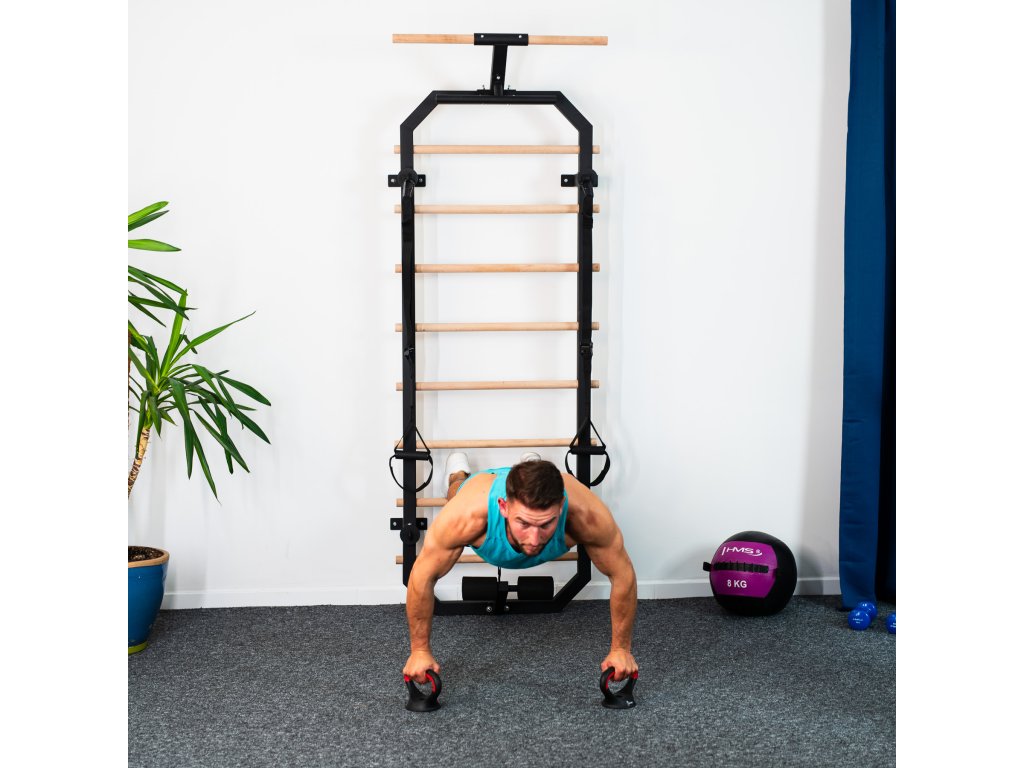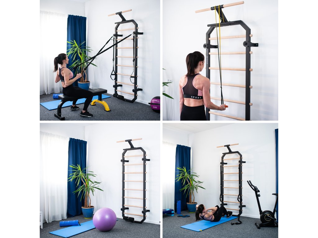 Priečky z bukového dreva sú pri inštalácii do rebríka zaistené skrutkou zo zadnej strany konštrukcie, takže zostávajú pevne na mieste a nekrútia sa. V hornej časti rebríkov sa nachádza 80 cm široká hrazda a kovová "polovičná hrazda", ktorú možno použiť napríklad na inštaláciu popruhov alebo expandérov, tie možno tiež pripevniť k oceľovým okám na 4 vzperách. V spodnej časti sa nachádza zarážka na nohy na tréning sed-ľah. Pre maximálne pohodlie sú zarážky vybavené penovými valčekmi.