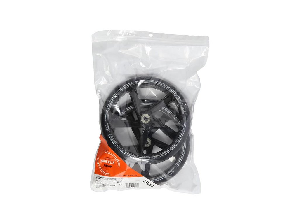 Náhradné kolieska pre freestylové kolobežky KH200 vyrobené z polyuretánu alebo ak je vo skratke PU. Najdôležitejšie parametre tohto typu kolies sú ich priemer a tvrdosť. Priemer kolies má priamy vplyv na rýchlosť jazdy a manévrovateľnosť. Na druhej strane tvrdosť určuje jazdný komfort a priľnavosť k zemi, na ktorej sa pohybujeme. To významne zvyšuje trvanlivosť kolies a súčasne pridáva dravý charakter. Súčasťou balenia sú aj ložiská ABEC 9.