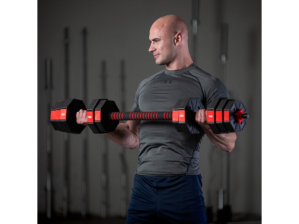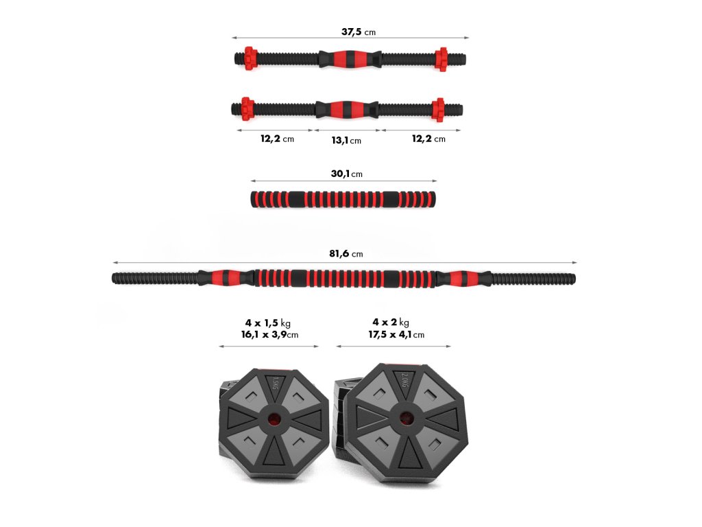 Kotúče sú vyrobené z trvdého plastu, ktorý je vyplnený cementom. Obojručné os je spojovacím dielom, do ktorého sa všroubují hriadeľa jednoručných činiek. Nakladacie tŕne sú opatrené závitom a závažia sa zabezpečuje pomocou hviezdicových matíc. Šesťhranný tvar kotúčov navyše zamedzuje ich odvaľovania. Činky sa Vám tak nikam neodkutálí a budete ich mať vždy tam, kde ste ich odložili.