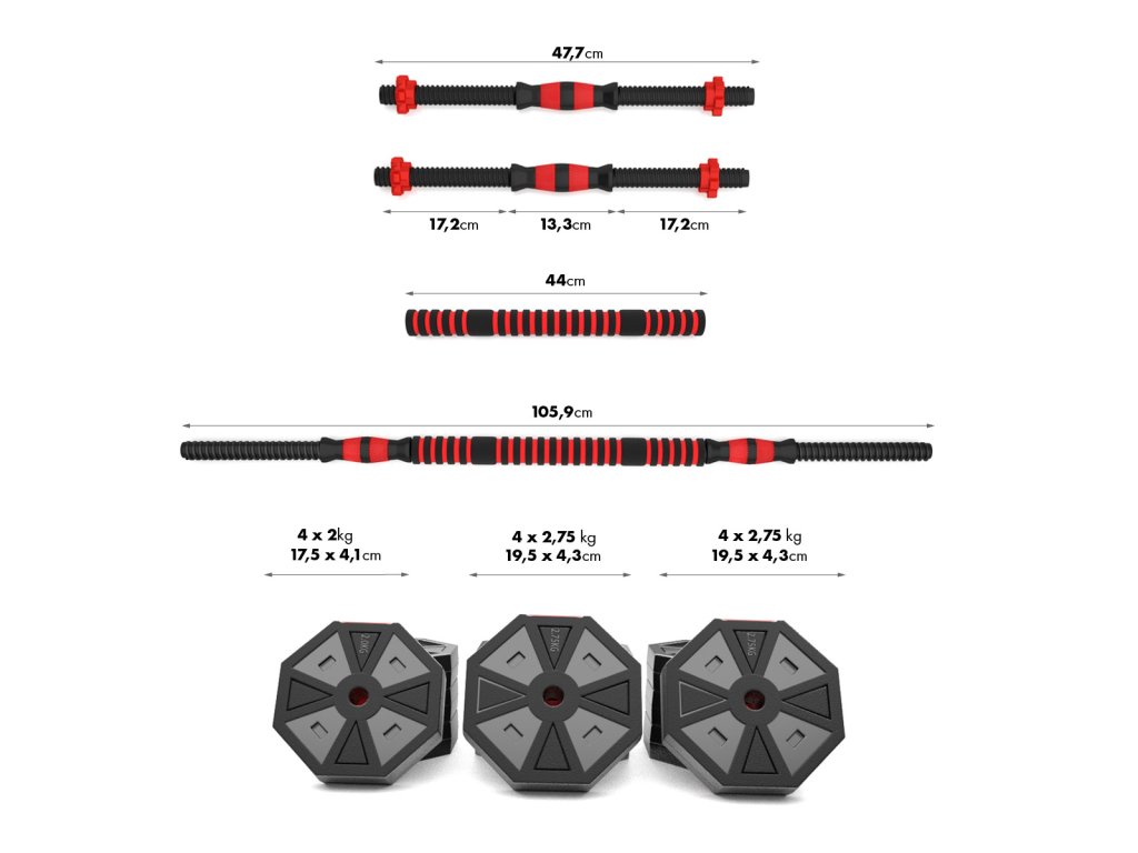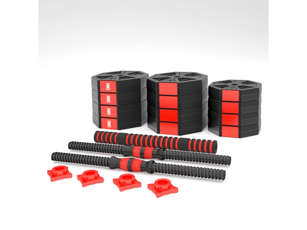 Kotúče sú vyrobené z trvdého plastu, ktorý je vyplnený cementom. Obojručné os je spojovacím dielom, do ktorého sa všroubují hriadeľa jednoručných činiek. Nakladacie tŕne sú opatrené závitom a závažia sa zabezpečuje pomocou hviezdicových matíc. Šesťhranný tvar kotúčov navyše zamedzuje ich odvaľovania. Činky sa Vám tak nikam neodkutálí a budete ich mať vždy tam, kde ste ich odložili.