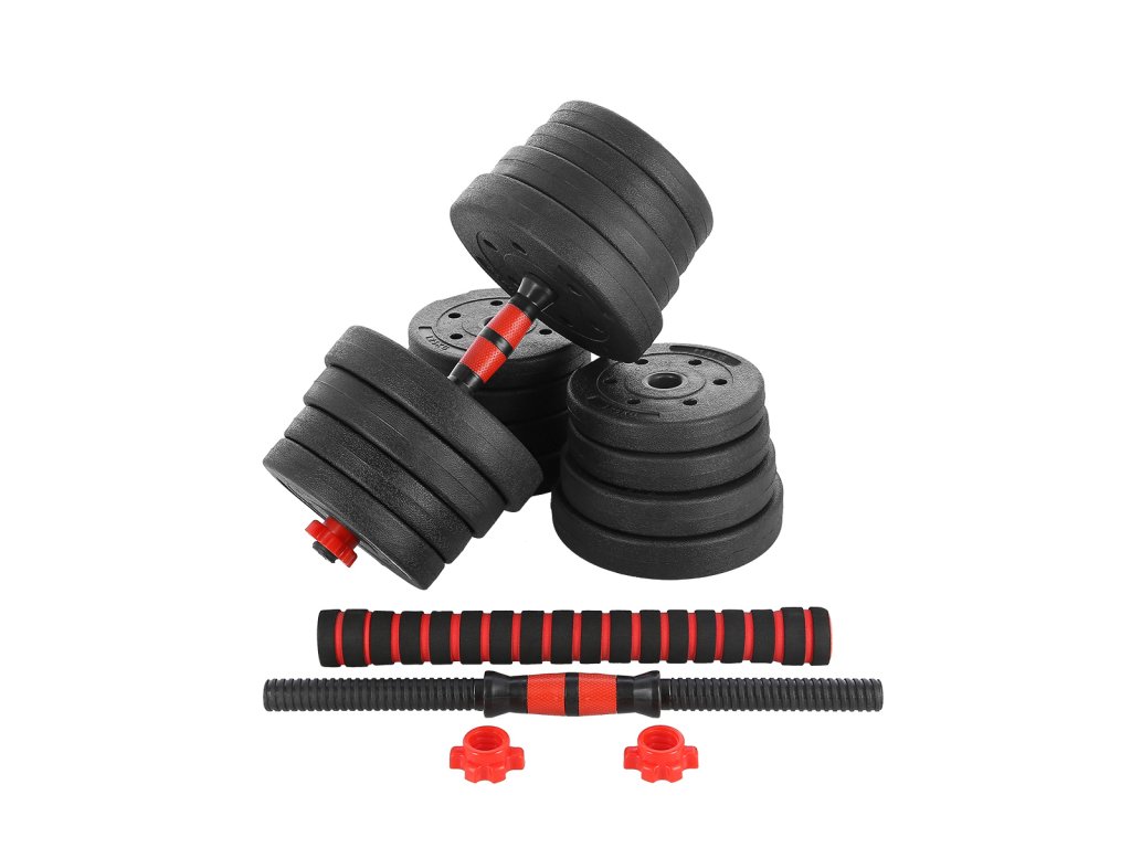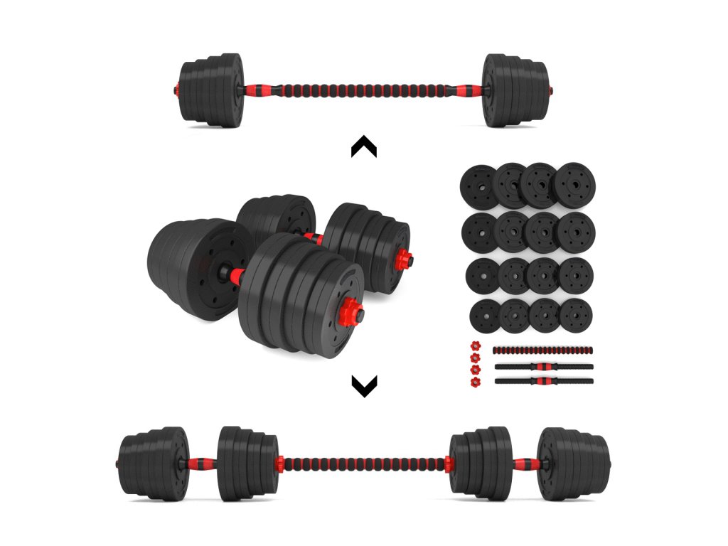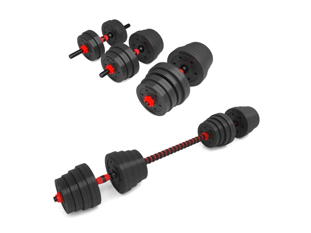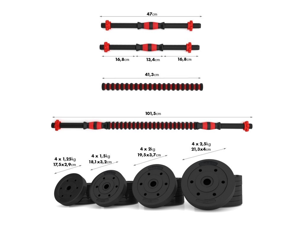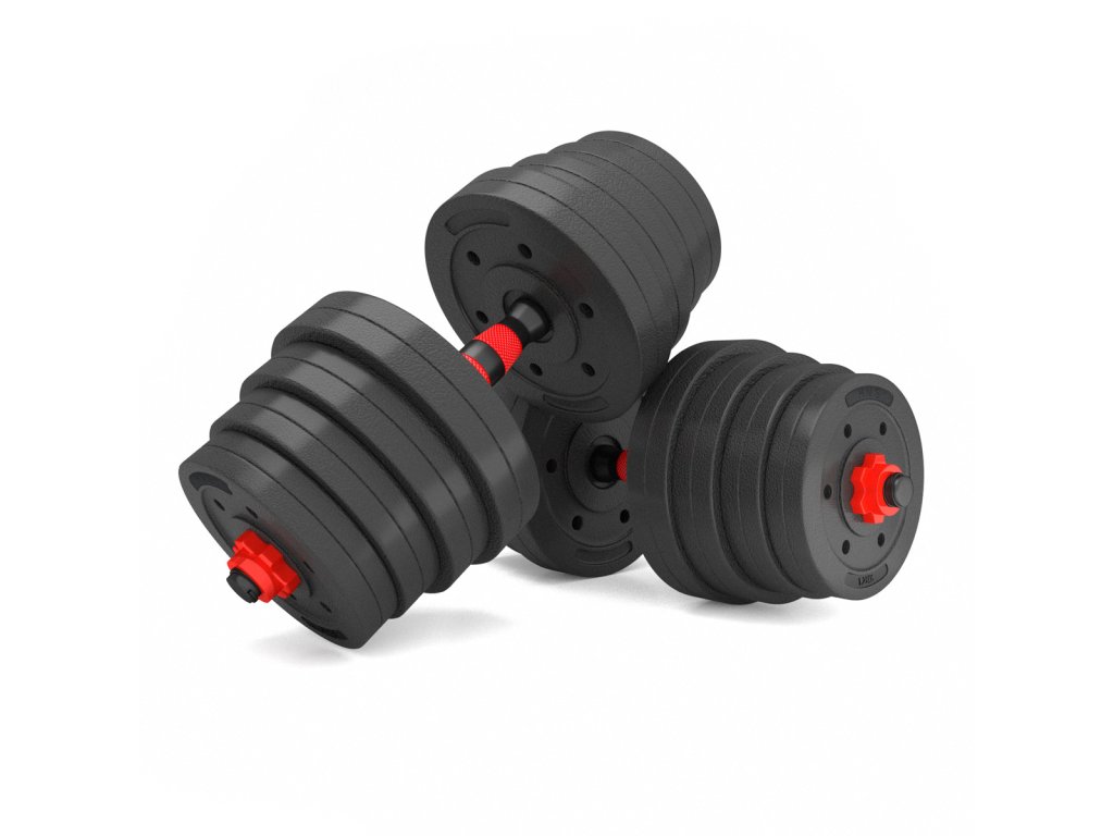 Kotúče sú vyrobené z trvdého plastu, ktorý je vyplnený cementom. Obojručné os je spojovacím dielom, do ktorého sa všroubují hriadeľa jednoručných činiek. Nakladacie tŕne sú opatrené závitom a závažia sa zabezpečuje pomocou hviezdicových matíc.