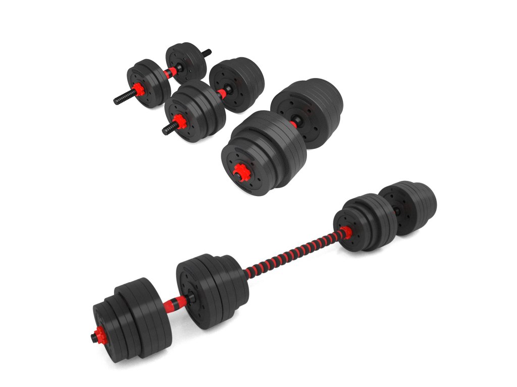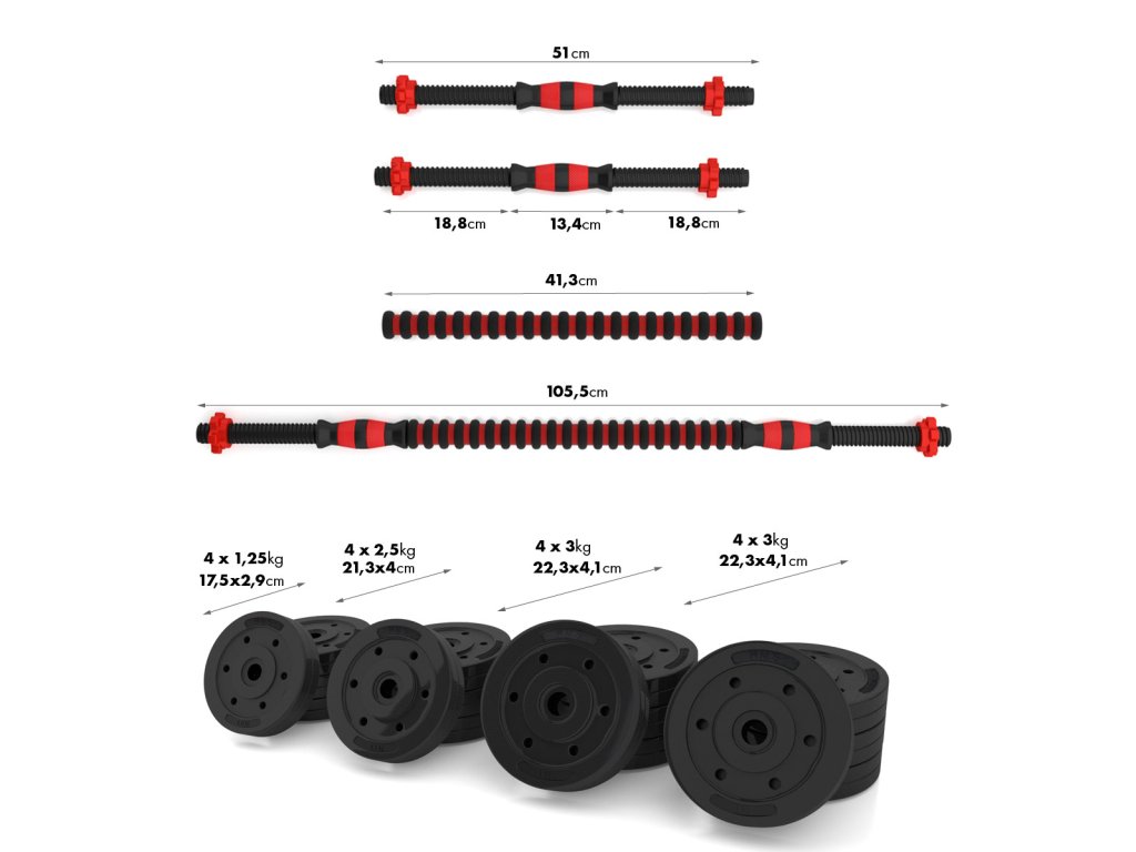 Kotúče sú vyrobené z trvdého plastu, ktorý je vyplnený cementom. Obojručné os je spojovacím dielom, do ktorého sa všroubují hriadeľa jednoručných činiek. Nakladacie tŕne sú opatrené závitom a závažia sa zabezpečuje pomocou hviezdicových matíc.