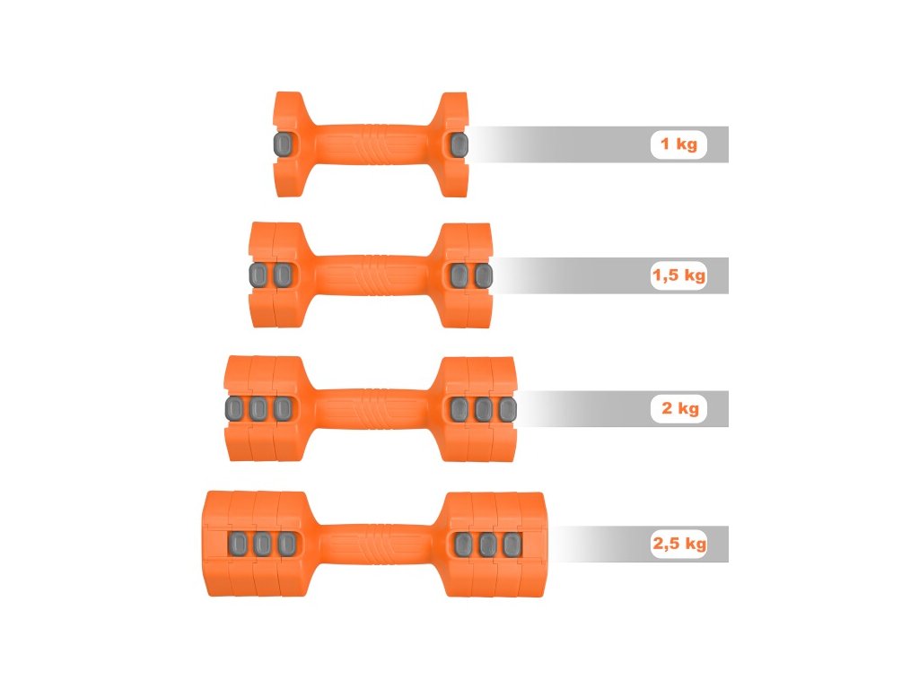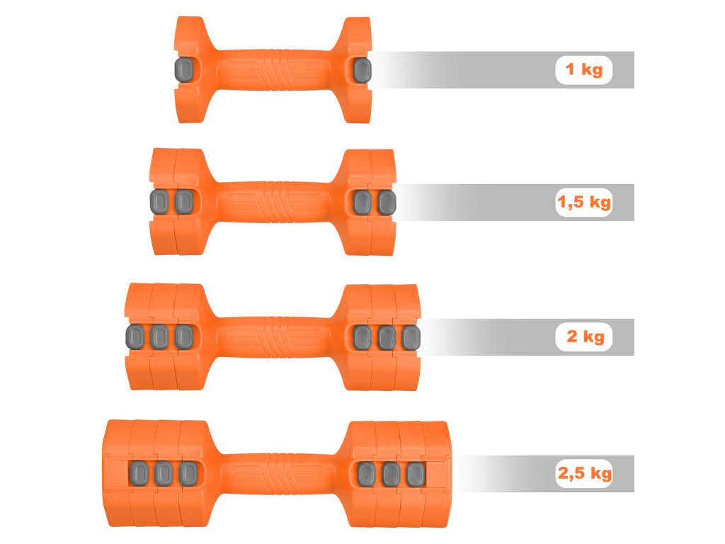 - 4v1 nastavenie hmotnosti – na každej činke: 1 / 1,5 / 2 / 2,5 kg – prispôsob záťaž konkrétnemu cvičeniu.