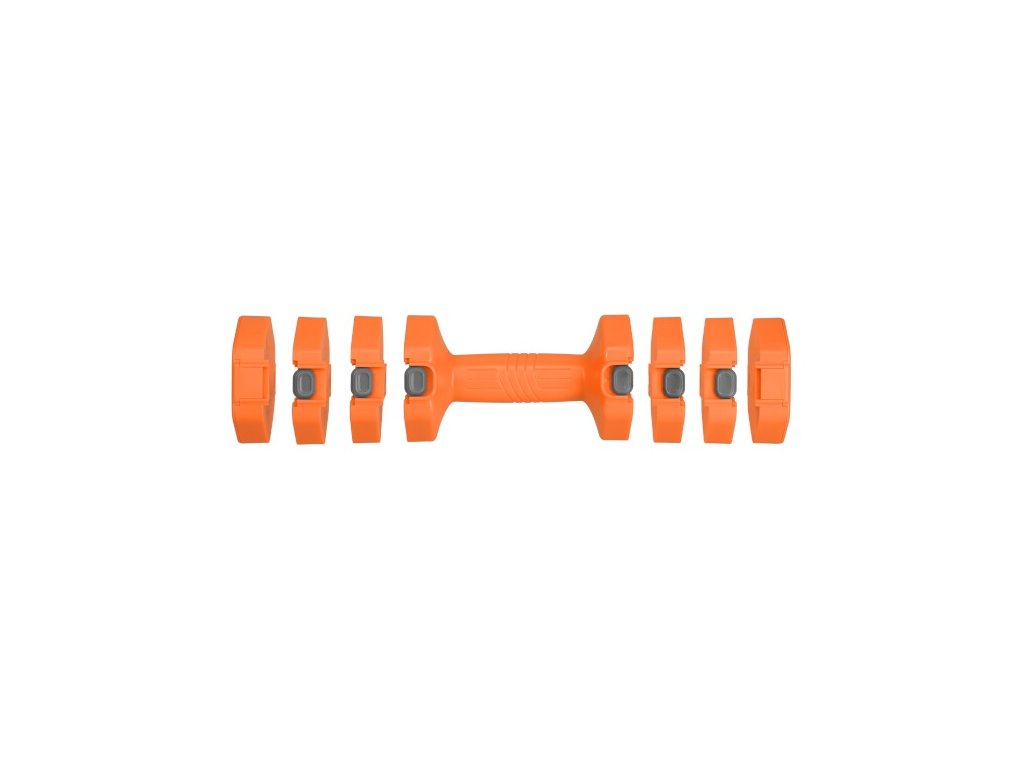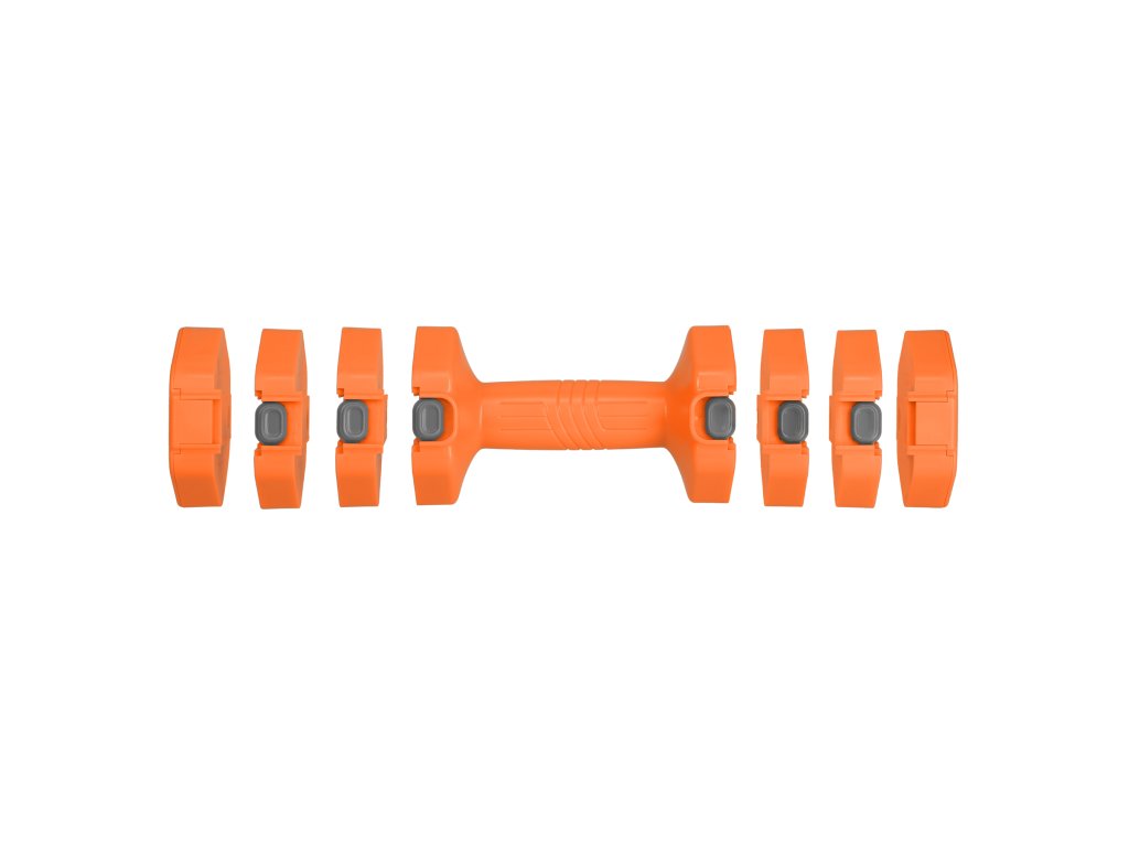 Mechanizmus založený na segmentových, galvanizovaných železných vložkách umožňuje jediným stlačením pridať alebo odobrať blok na oboch činkách. Zmeníš hmotnosť od 1 do 2,5 kg na kus – bez prídavných kotúčov alebo uzáverov.
