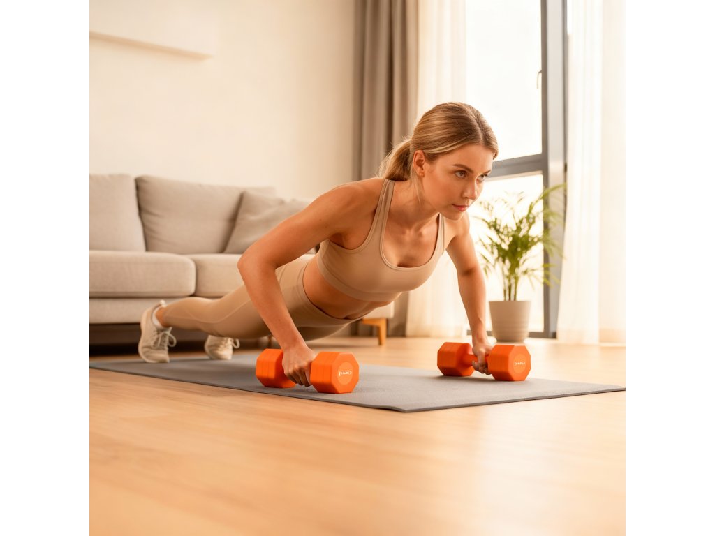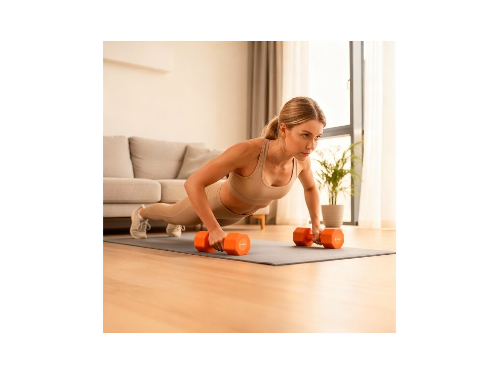 ABS povlak tlmí kontakt s podlahou a pohlcuje hluk, zatiaľ čo protišmyková rukoväť zaisťuje stabilný úchop pri zdvíhaní a dynamických cvičeniach (aerobik, HIIT). Hexagonálny tvar zvyšuje bezpečnosť pri odkladaní a umožňuje využitie činiek ako oporu.