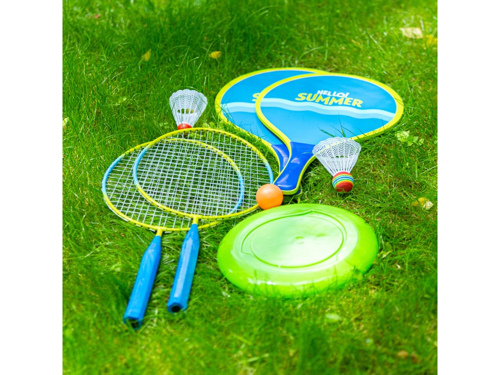 NILS NRZ053 je sada, ktorá obsahuje dve oceľové rakety, dve drevené rakety, dve letky, gumovú loptičku a plastové frisbee.