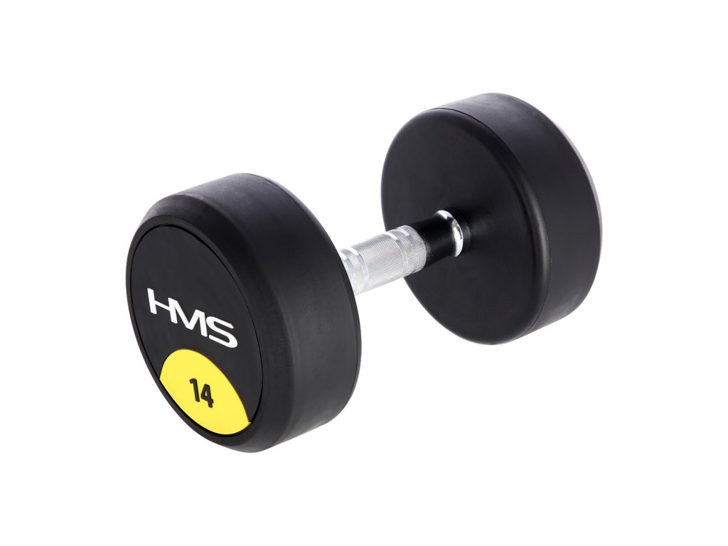 14 kilogramová jednoručná činka HMS HG Pro je určená pre profesionálne použitie ako doma tak v posilňovni. Závažie tvorí liatinový odliatok pokrytý hrubou vrstvou gumy, ktorá ochráni ako činku, tak podklad pred poškodením. Na čelnej strane je značka HMS a údaj o hmotnosti v kilogramoch. Rukoväť je vyrobená z chrómovanej ocele, pre pohodlný úchop má súdkovitý tvar s vrúbkovaným povrchom.