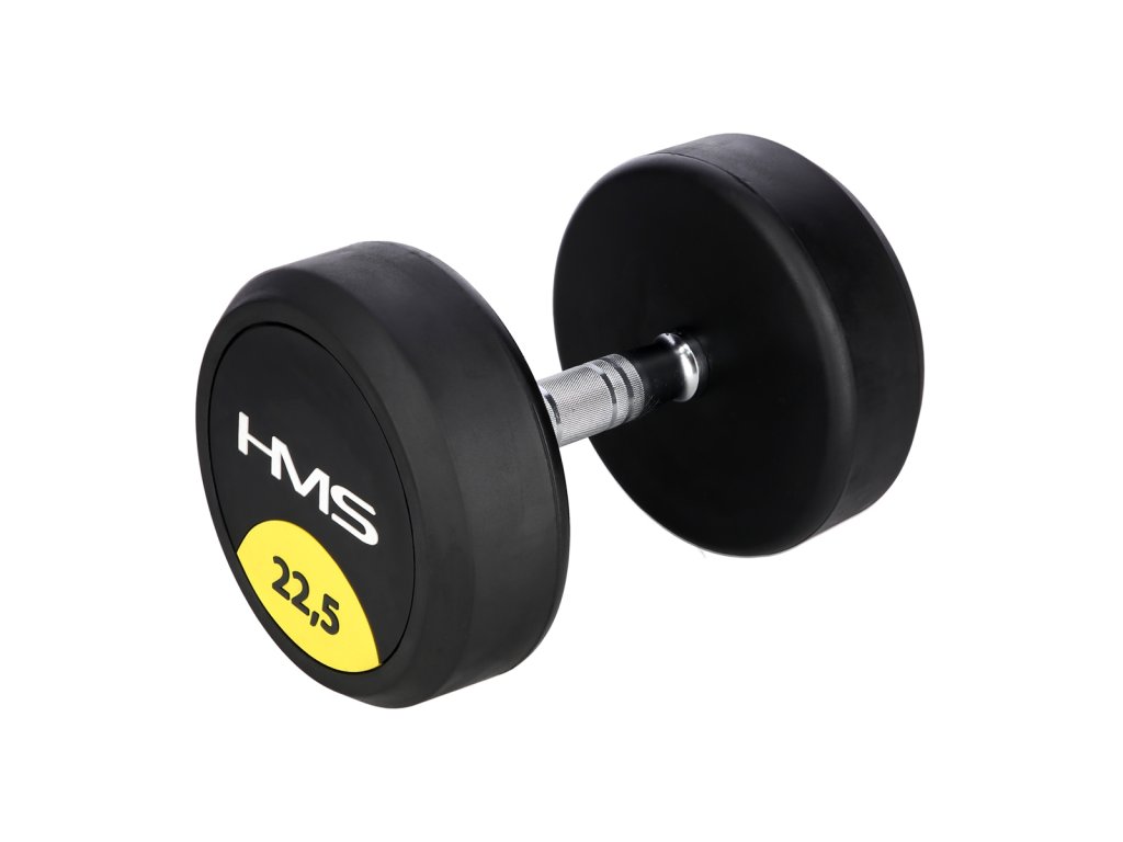 22,5 kilogramová jednoručná činka HMS HG Pro je určená pre profesionálne použitie ako doma tak v posilňovni. Závažie tvorí liatinový odliatok pokrytý hrubou vrstvou gumy, ktorá ochráni ako činku, tak podklad pred poškodením. Na čelnej strane je značka HMS a údaj o hmotnosti v kilogramoch. Rukoväť je vyrobená z chrómovanej ocele, pre pohodlný úchop má súdkovitý tvar s vrúbkovaným povrchom.