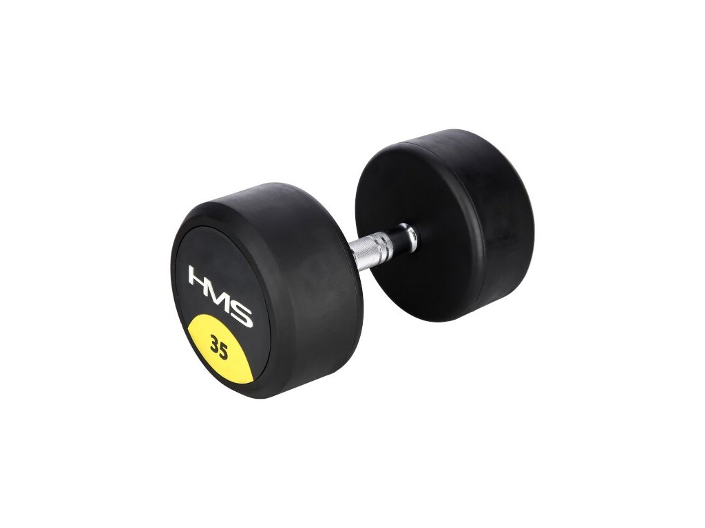 35 kilogramová jednoručná činka HMS HG Pro je určená pre profesionálne použitie ako doma tak v posilňovni. Závažie tvorí liatinový odliatok pokrytý hrubou vrstvou gumy, ktorá ochráni ako činku, tak podklad pred poškodením. Na čelnej strane je značka HMS a údaj o hmotnosti v kilogramoch. Rukoväť je vyrobená z chrómovanej ocele, pre pohodlný úchop má súdkovitý tvar s vrúbkovaným povrchom.