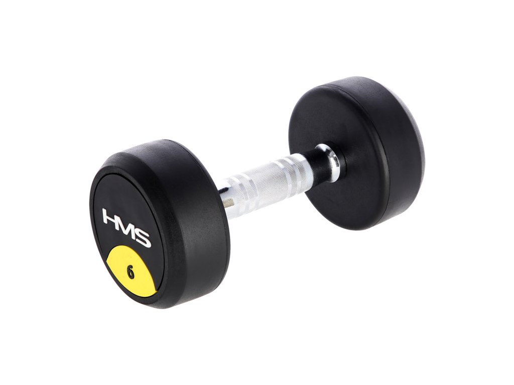 6 kilogramová jednoručná činka HMS HG Pro je určená pre profesionálne použitie ako doma tak v posilňovni. Závažie tvorí liatinový odliatok pokrytý hrubou vrstvou gumy, ktorá ochráni ako činku, tak podklad pred poškodením. Na čelnej strane je značka HMS a údaj o hmotnosti v kilogramoch. Rukoväť je vyrobená z chrómovanej ocele, pre pohodlný úchop má súdkovitý tvar s vrúbkovaným povrchom.