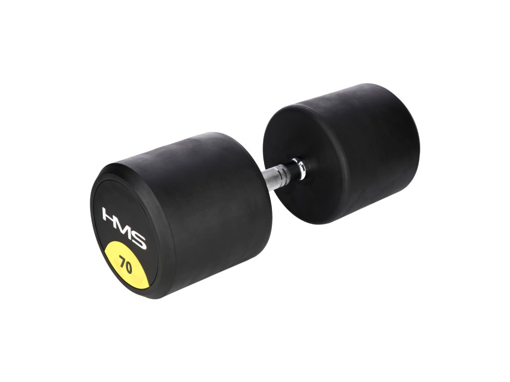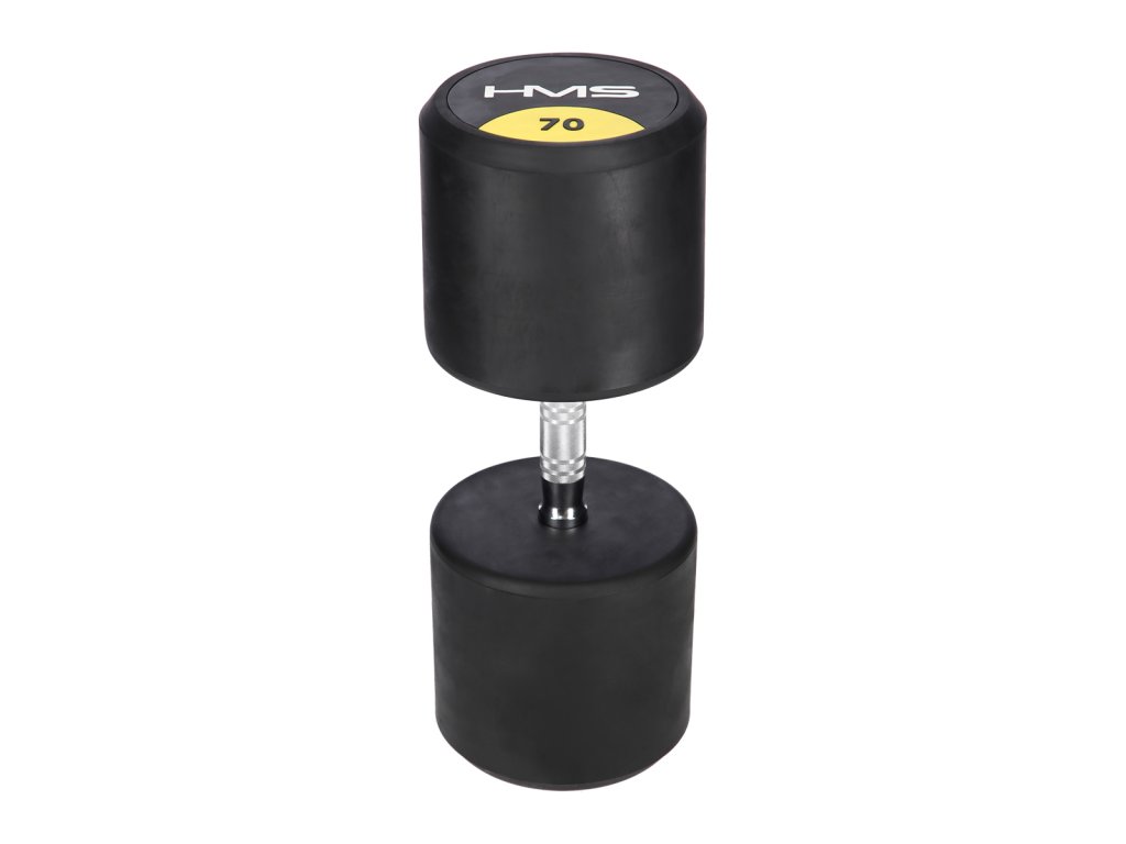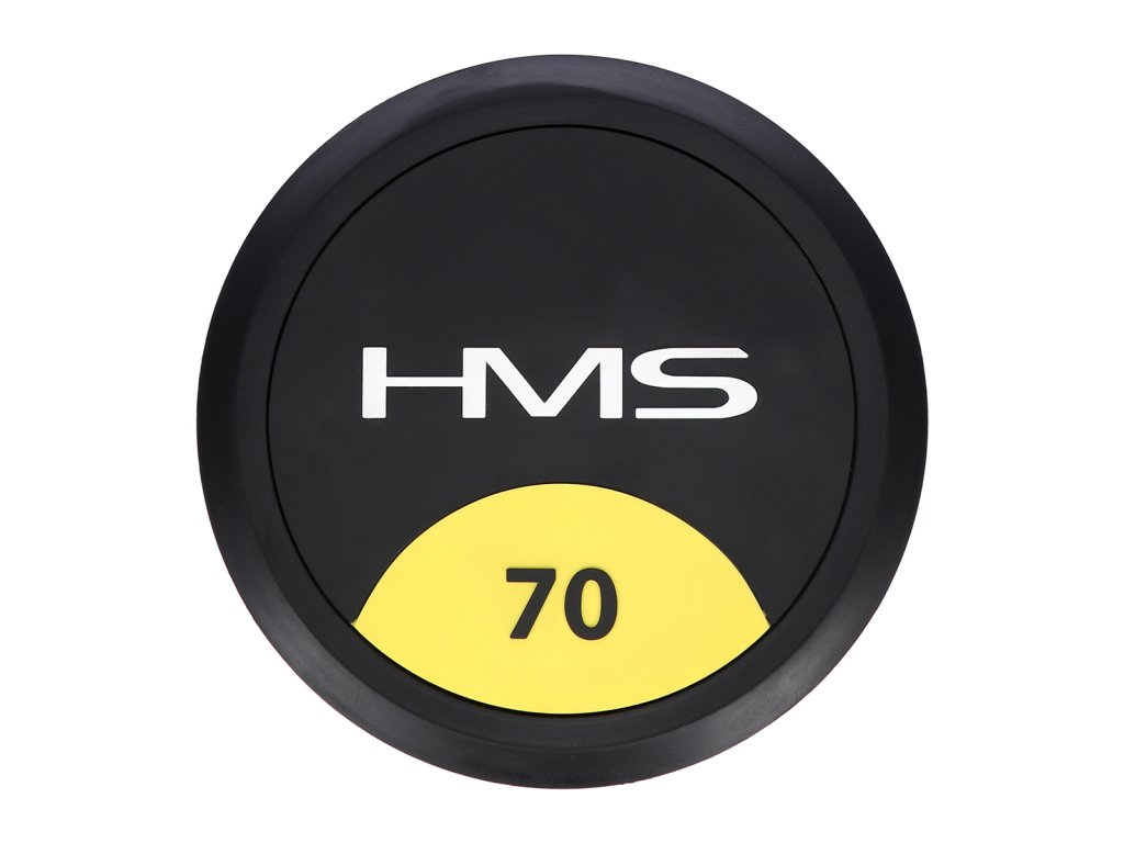 70 kilogramová jednoručná činka HMS HG Pro je určená pre profesionálne použitie ako doma tak v posilňovni. Závažie tvorí liatinový odliatok pokrytý hrubou vrstvou gumy, ktorá ochráni ako činku, tak podklad pred poškodením. Na čelnej strane je značka HMS a údaj o hmotnosti v kilogramoch. Rukoväť je vyrobená z chrómovanej ocele, pre pohodlný úchop má súdkovitý tvar s vrúbkovaným povrchom.