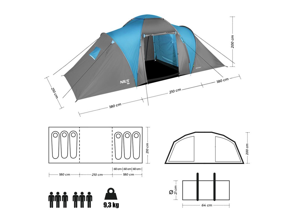 Ak hľadáte odolný a pohodlný a dostatočne priestranný stan na rodinnú dovolenku v kempe - model NILS Camp NC6031 Highland je ideálnou voľbou pre vás. Tento dvojplášťový stan pojme až šesť osôb v dvoch samostatných spálňach. Ďalšou výhodou je priestranná predsieň s podlahou, ktorá poskytuje pohodlné miesto na spoločné trávenie času alebo uskladnenie vybavenia bez ohľadu na počasie.