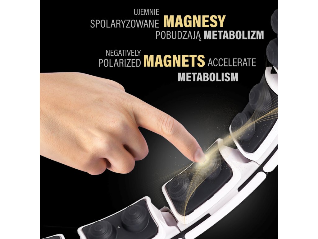 Magnetický hula hoop HHM16 je vynikajúcim riešením, ktoré pomáha v boji so zbytočnými kilogramami umiestnenými okolo brucha, bokov a zadku. Magnety, ktoré sú pripevnené k vnútornému rámu obruče, sú negatívne polarizované. Toto usporiadanie stimuluje metabolizmus. Magnety sú výkonovo dokonale zladené, takže sa o svoju postavu môžete s HHM16 efektívne starať bez ohľadu na váš vek alebo zdravotný stav! Pružiny umiestnené vo výstupkoch umiestnených po celom vnútornom obvode slučky pohybom o 360 stupňov dokonale absorbujú preťaženie a prispôsobujú sa telu, čo vytvára dodatočný masážny efekt a poskytuje telu príjemný pocit. Trojrozmerná masážna technika rýchlo stimuluje svaly. Vstavané výstupky so špeciálne vyvinutým tvarom majú tlmia rázy pre pohodlný tréning. Intenzitu vibrácií upravíte zmenou rýchlostí krúženia bokov.