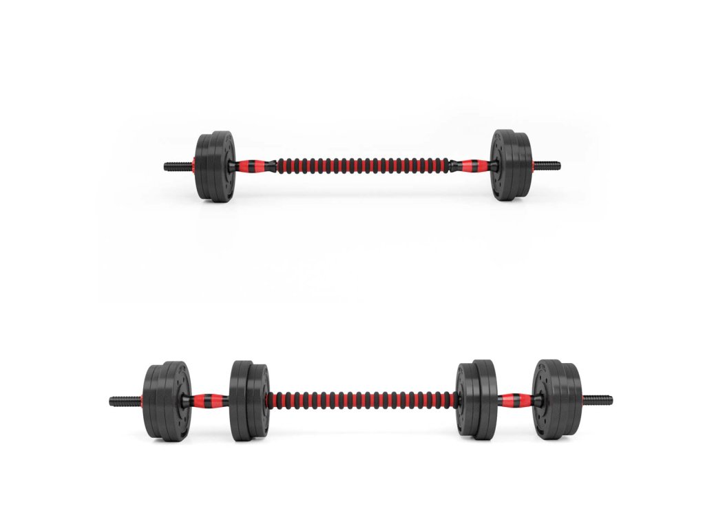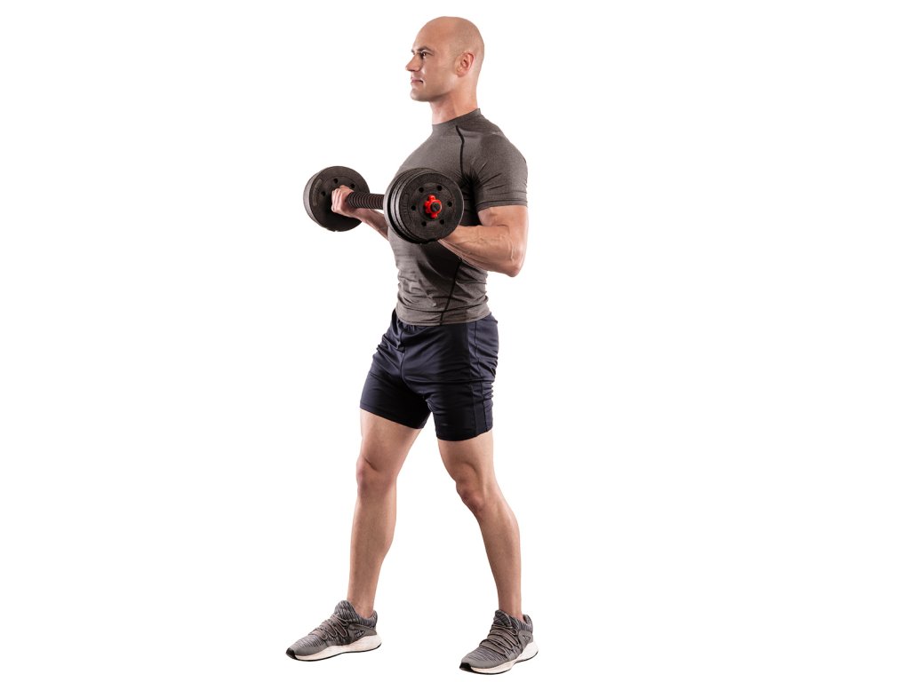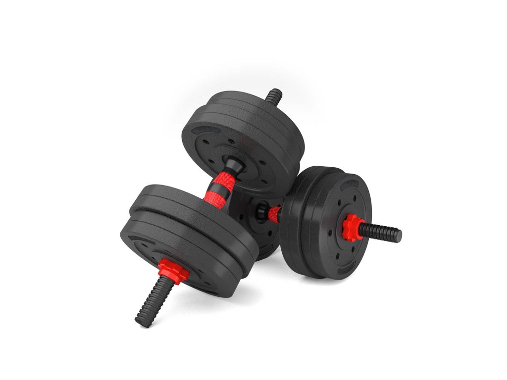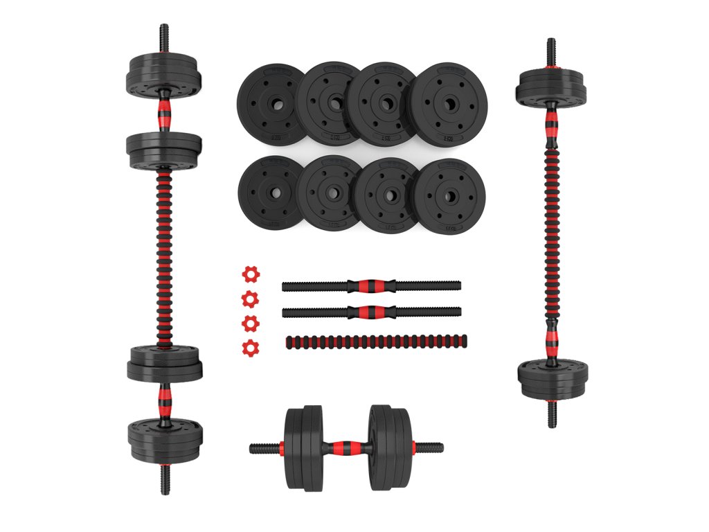 Disky sú vyrobené z odolného plastu, ktorý je vyplnený cementom. Osa obojručnej činky je spojovacia časť, do ktorej sú priskrutkované hriadele jednoručných činiek. Nakladacie tŕne majú závit a závažia sú zaistené hviezdicovými maticami.