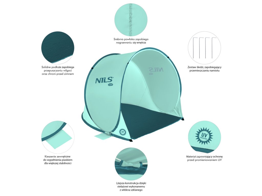 Plážový stan NILS Camp NC3173 môžete používať nielen počas dovolenky pri mori, ale aj na verejnom kúpalisku alebo pri bazéne v záhrade. Stan NC3173 sa rozkladá okamžite, je odolný a funkčný, ale predovšetkým poskytne účinnú ochranu pred slnečnými lúčmi, poskytne tieň a úkryt pred vetrom.
