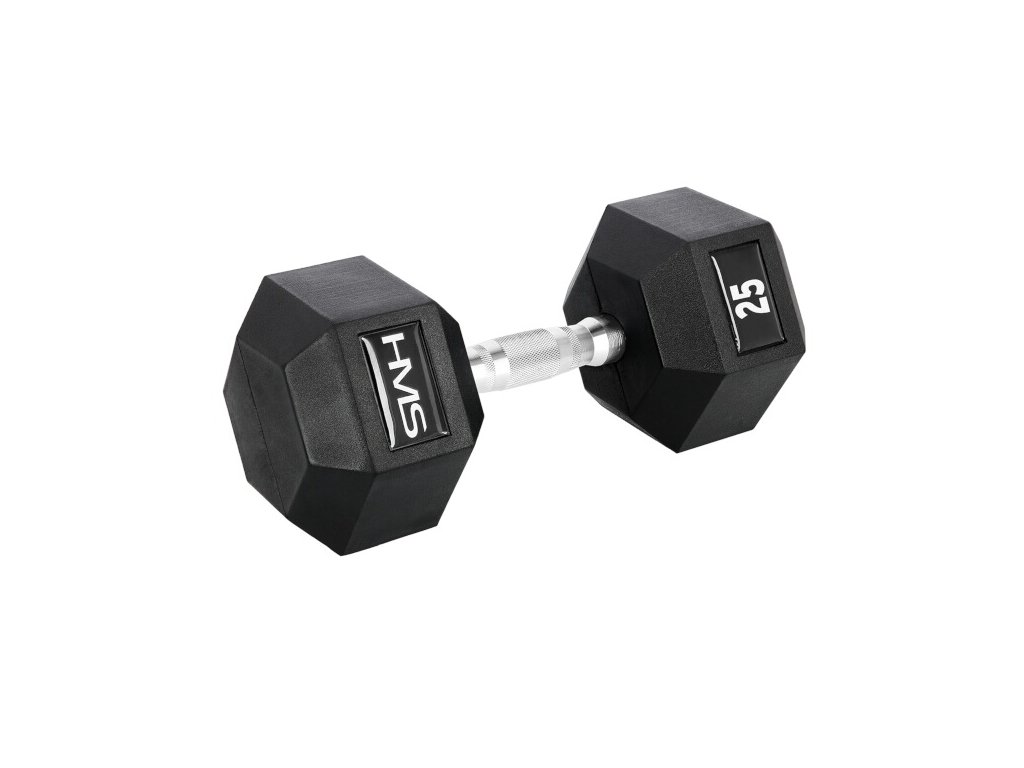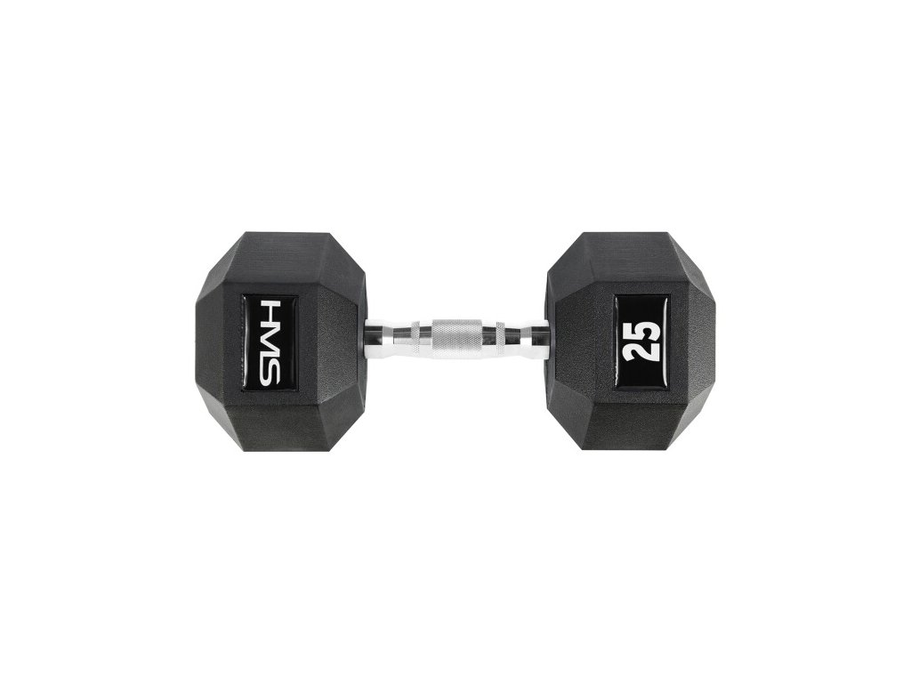 Šesťhranná jednoručná činka s hmotnosťou 25 kg určená na profesionálne použitie doma aj v posilňovni. Šesťuholníkový tvar zabraňuje nechcenému pohybu činky pri odkladaní a pogumovaný dizajn predlžuje jej životnosť. Pochrómovaná rukoväť má drážky na bezpečnejšie držanie.