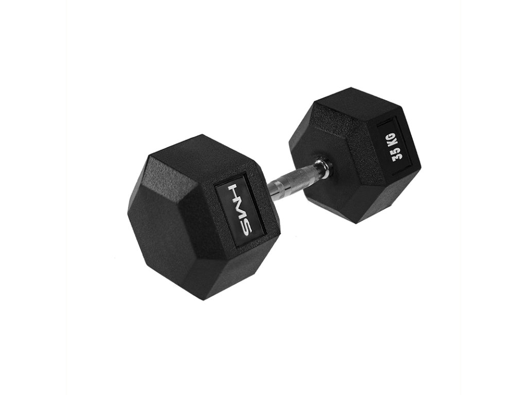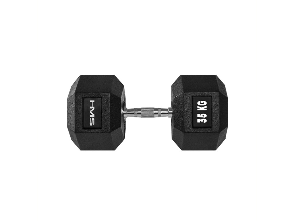 Šesťhranná jednoručná činka s hmotnosťou 35 kg určená na profesionálne použitie doma aj v posilňovni. Šesťuholníkový tvar zabraňuje nechcenému pohybu činky pri odkladaní a pogumovaný dizajn predlžuje jej životnosť. Pochrómovaná rukoväť má drážky na bezpečnejšie držanie.