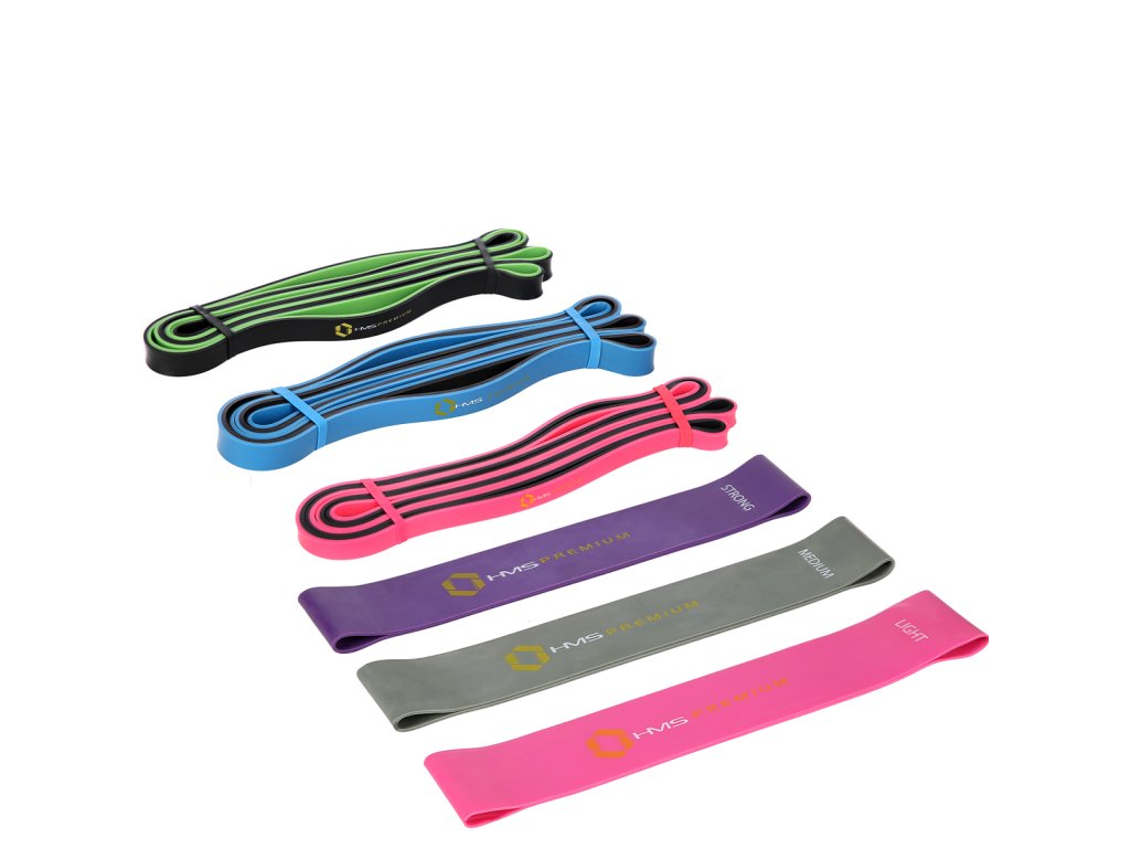 Set 3 krátkych a 3 dlhých posilňovacích gúm HMS PREMIUM ktoré sú využívané v silovom tréningu, kondičnom tréningu, ale aj v rehabilitačnom cvičení. V silovom tréningu slúži ako dopomoc alebo ako dynamická záťaž. Pri rehabilitácii sú využité pretože nejde o priamu záťaž, ale guma postupným ťahom vytvára odpor a to predovšetkým pri úrazoch svalov, šliach a kĺbov.
