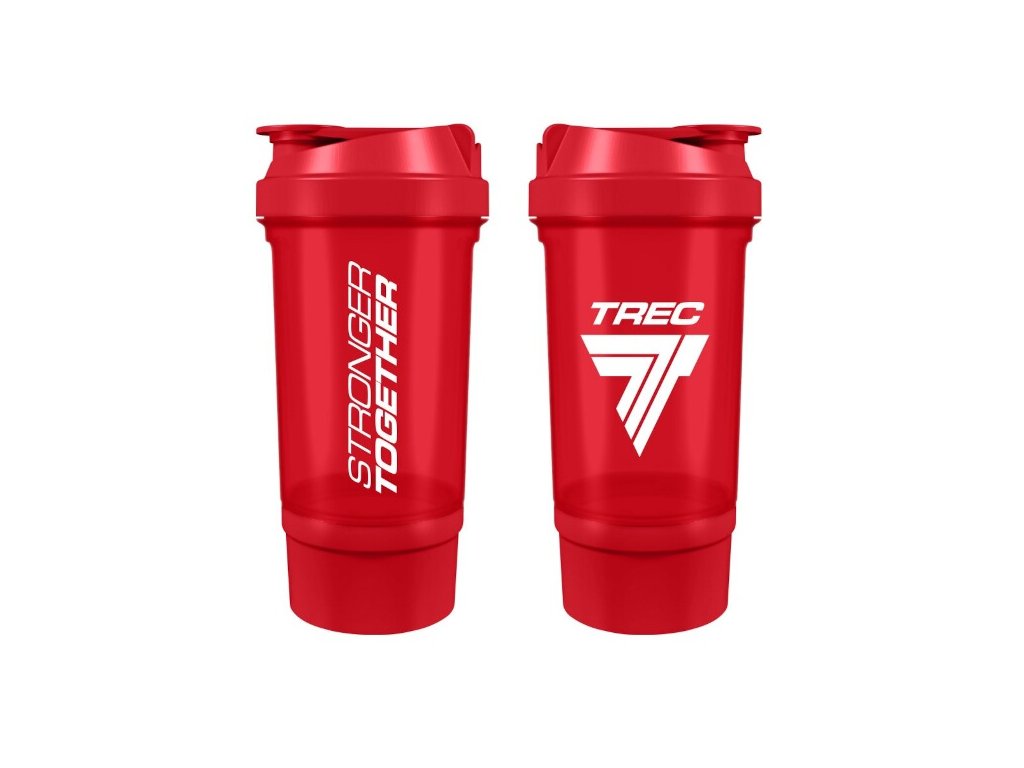 Šejker so zásobníkom od spoločnosti Trec Nutrition má objem 500 ml, samostatný zásobník, sitko a odmerku na boku.