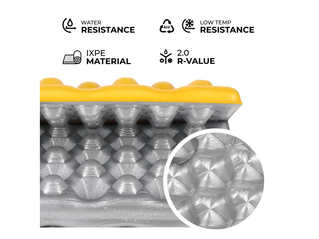Podložka je vyrobená z vysoko kvalitnej peny IXPE – materiálu, ktorý sa vyznačuje zvýšenou pružnosťou a odolnosťou, a zároveň zostáva ľahký, odolný a nevsakuje vodu. IXPE si zachováva svoj tvar aj pri intenzívnom používaní, čo zaručuje dlhodobý komfort.