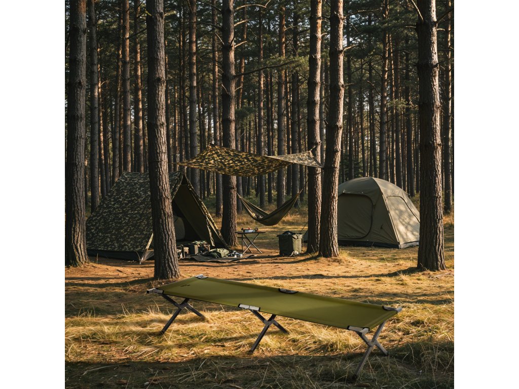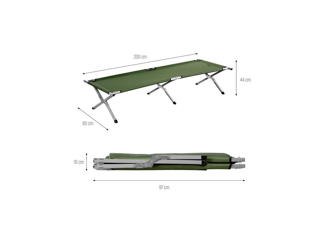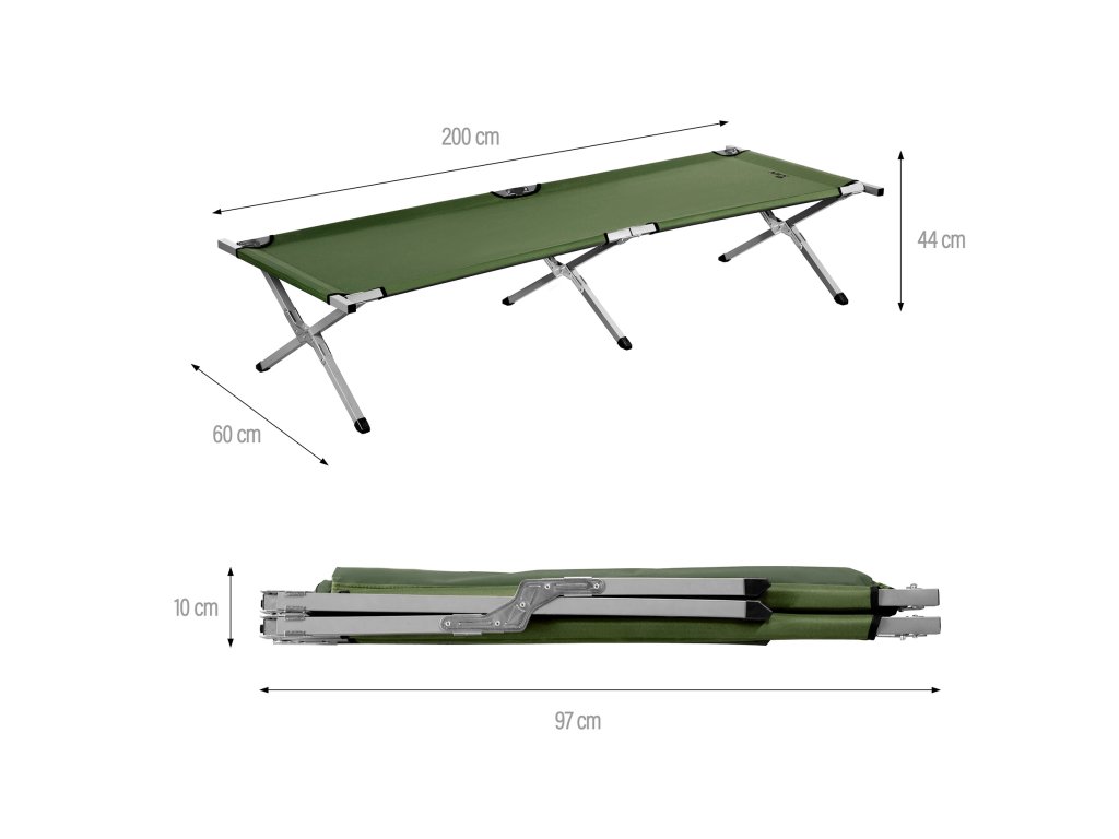 S dĺžkou 200 cm a šírkou 60 cm poskytuje posteľ pohodlný priestor na spanie aj vysokým ľuďom. S výškou 44 cm vás lôžko chráni pred chladom a vlhkosťou od zeme, čo výrazne zvyšuje komfort pri prenocovaní v teréne.