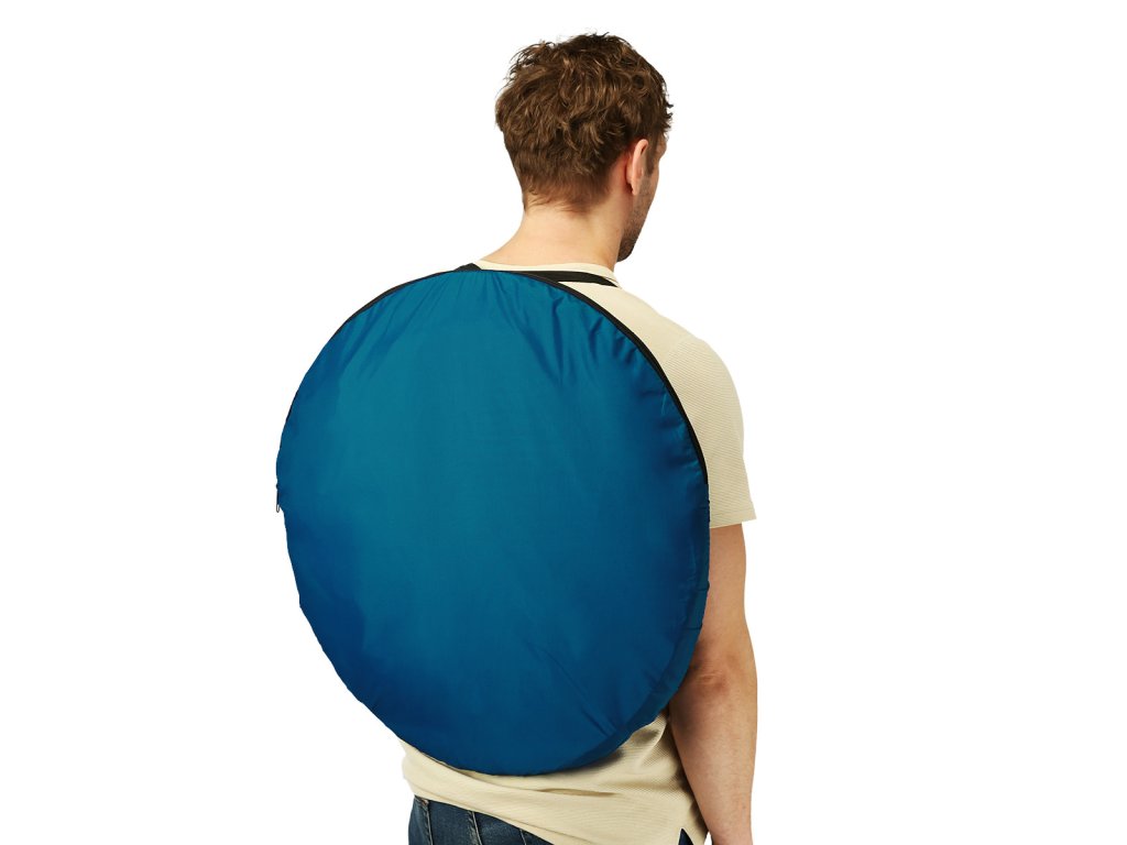 Vonkajšia vrstva je vyrobená z odolného polyesteru s vodeodolným záterom, ktorý chráni pred dažďom a vlhkosťou. Z vnútornej strany je nanesená strieborná izolačná vrstva, ktorá zabraňuje prehrievaniu kabíny od slnečných lúčov. Materiál je plne krycí a nepriehľadný, takže používanie prezliekárne zaručuje pohodlie a diskrétnosť.