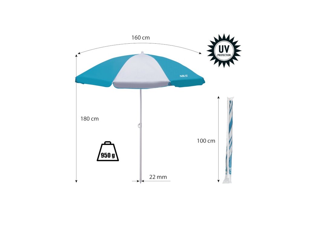 Plážový slnečník NILS Camp NC7813 je ideálnym partnerom na slnečné popoludnie na pláži alebo v záhrade. Slnečník sa ľahko prenáša vďaka dodanej taške s ramenným popruhom. Spodná tyč je vybavená hrotom na jednoduché zapichnutie do zeme. Polyesterová tkanina má priemer 160 cm a dokonale chráni pred slnečným žiarením a škodlivým UV žiarením. Rám sa dá nakloniť.