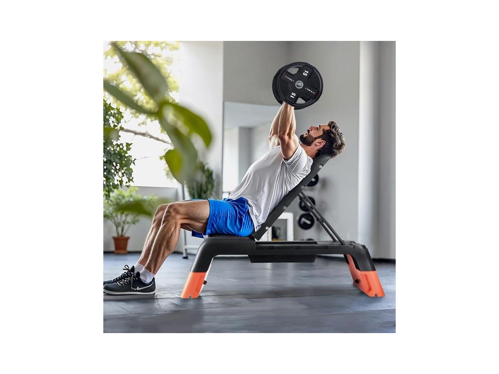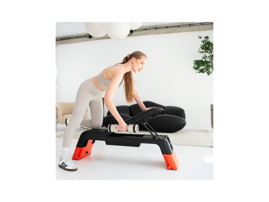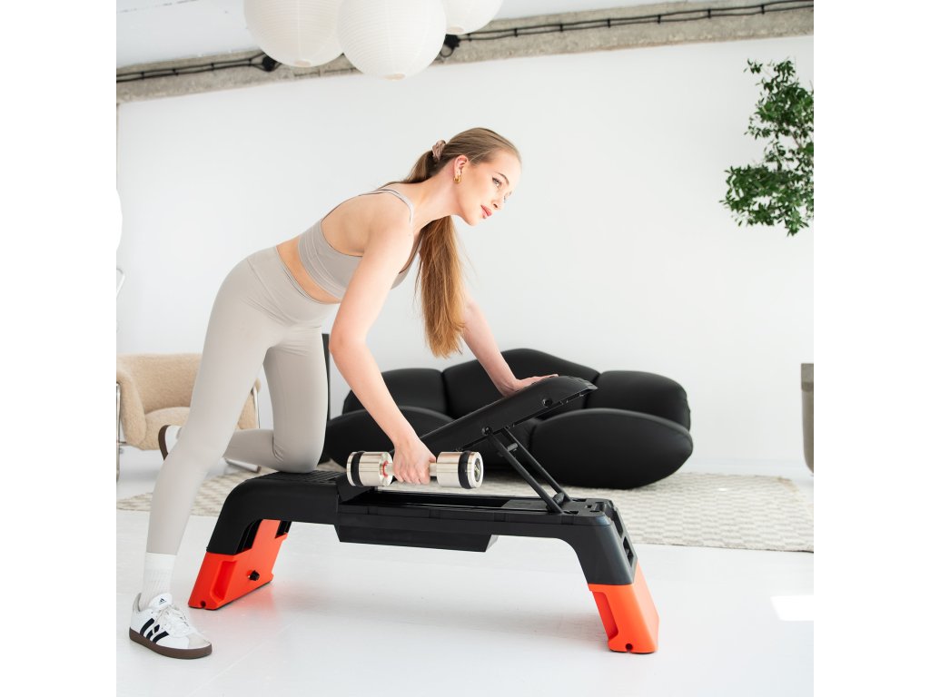 Počas pár sekúnd môžete schodík premeniť na plnohodnotnú posilňovaciu lavicu! Možnosť nastavenia operadla do troch rôznych uhlov umožňuje vykonávať širokú škálu silových cvikov, napr. s činkami alebo odporovými gumami. Toto riešenie kombinuje kondičné so silovým tréningom a umožňuje vám naplno využiť potenciál vášho tela.