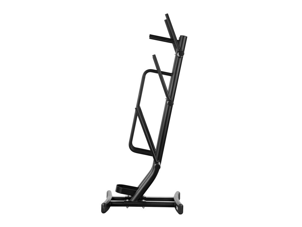 Stojan je vybavený šiestimi tŕňmi na kotúče, ktoré umožňujú pohodlné rozloženie závažia rôznych hmotností. Navyše má špeciálny držiak na osi, takže všetko vybavenie je prehľadne usporiadané a ľahko dostupné počas tréningu.