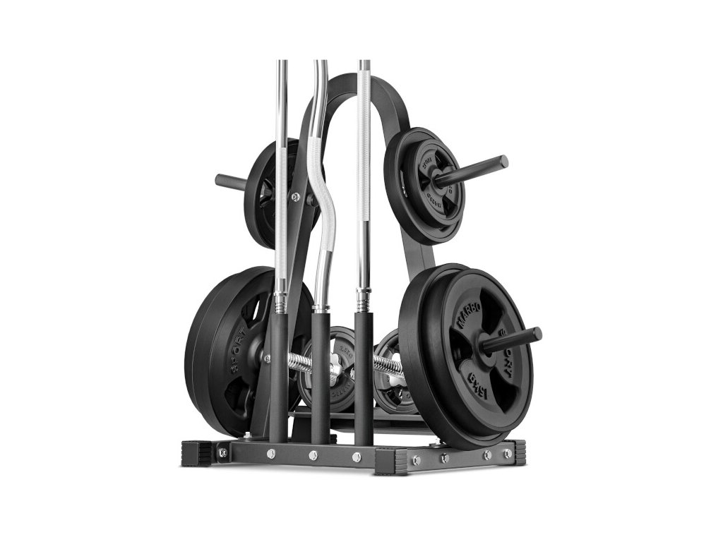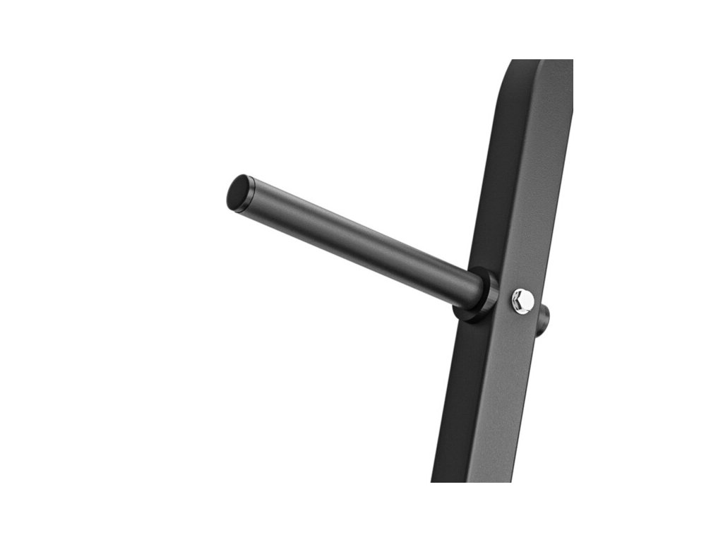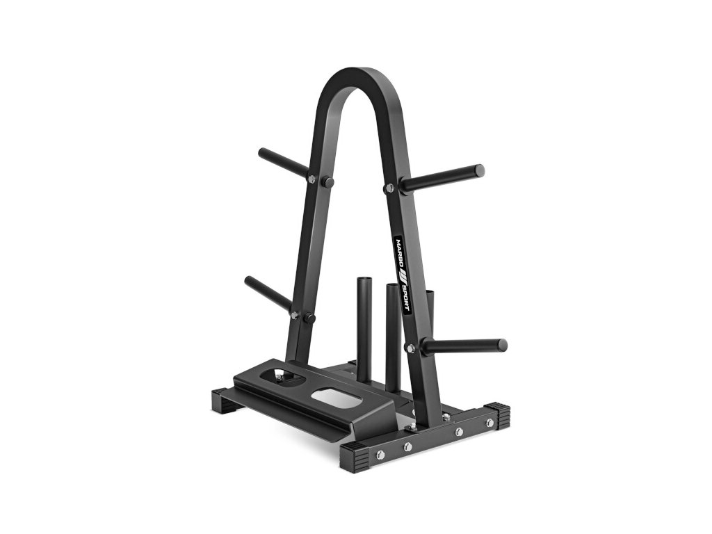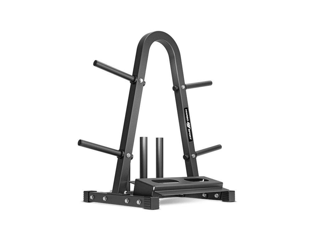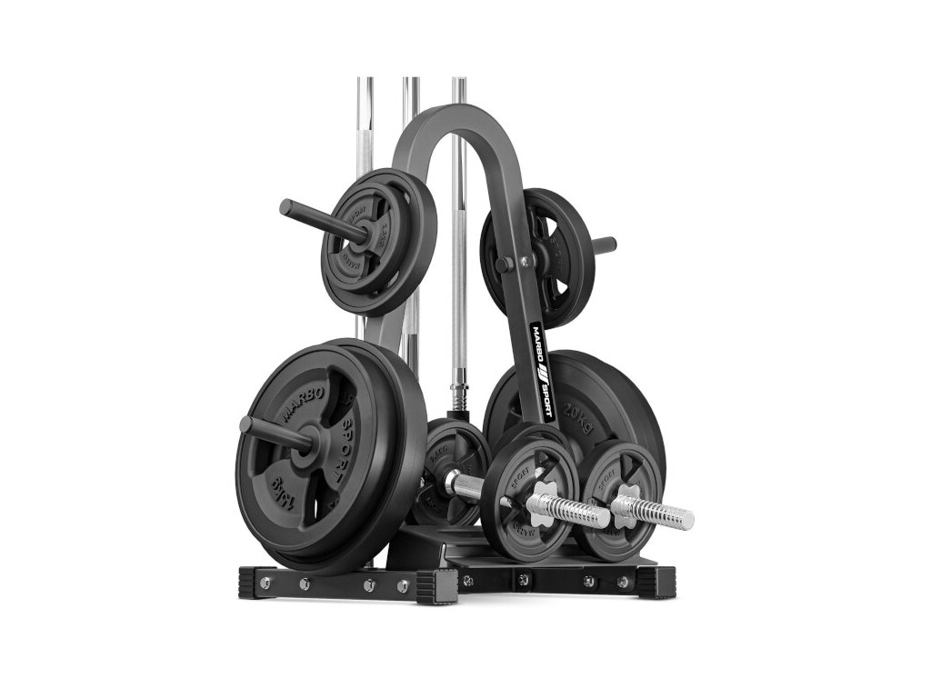 Stojan na závažia, činky a obojručné osi MARBO MH-S007 je ideálny na udržiavanie poriadku a organizácie v domácej posilňovni. Konštrukcia je vyrobená z oceľového profilu 40 x 40 mm a dosahuje nosnosť 300 kg. Do spodnej police možno uložiť 2 jednoručné činky. Na zadnej strane stojana sa nachádzajú 3 vertikálne rúrky s vnútorným priemerom 32 milimetrov, ktoré slúžia ako stojany na obojručné osi s priemerom 28 alebo 30 milimetrov. 4 tŕne na zavesenie závažia majú dĺžku 20 centimetrov a priemer 15 milimetrov. Koniec tŕňa je vybavený gumovým krúžkom, ktorý zabraňuje poškriabaniu konštrukcie.