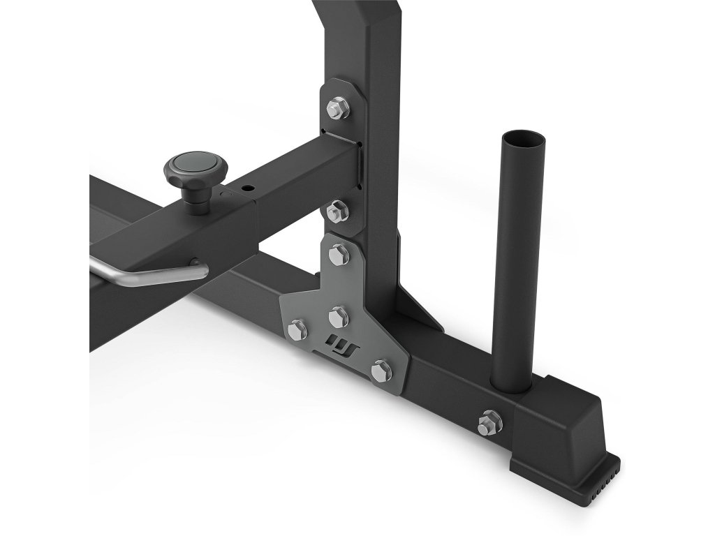 Stojany sú prepojené priečkou. Rozteč medzi nimi možno ľahko a rýchlo nastaviť. K dispozícii sú 3 polohy: 100, 110 a 120 cm. Vďaka tomu môžete počas tréningu používať osi rôznych dĺžok bez obáv o stabilitu istenia. Stojany zostanú na svojom mieste a nerozbehnú sa ani pri prudkom odložení závažia.